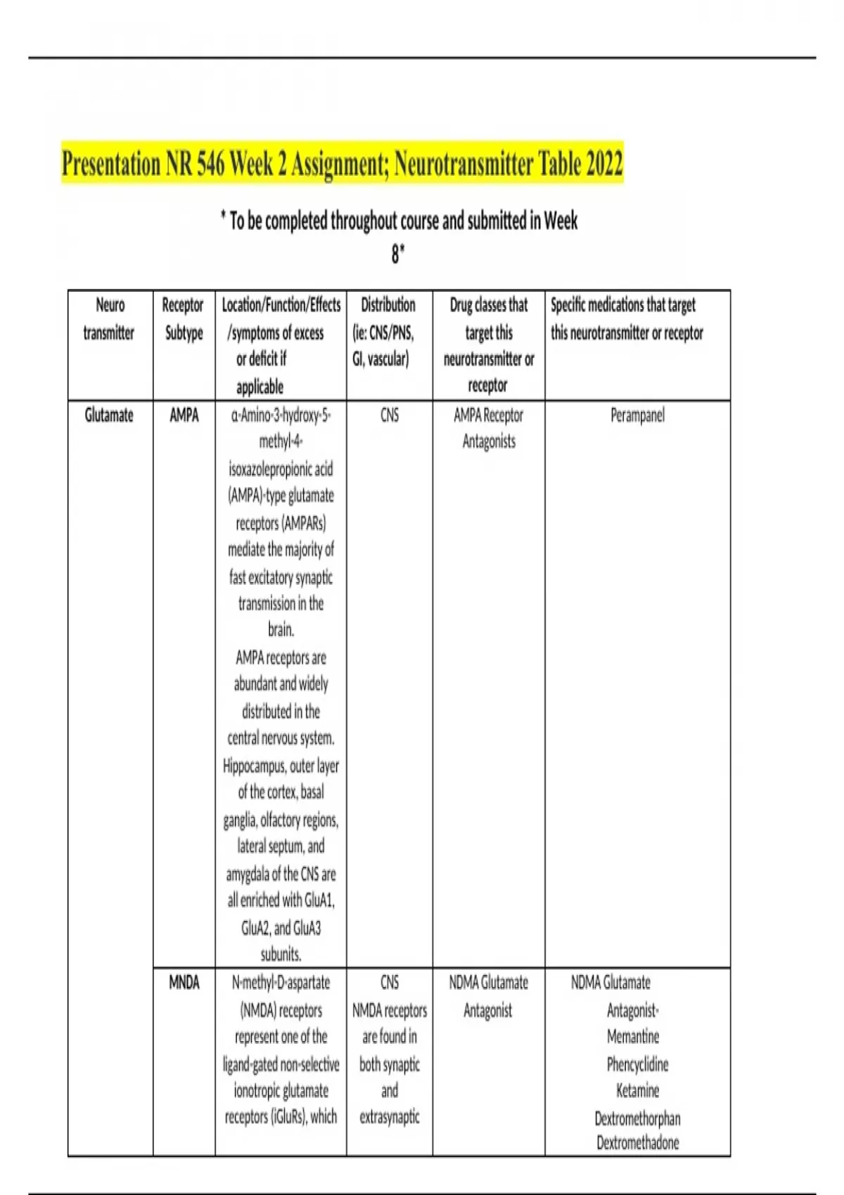 Presentation NR 546 Week 2 Assignment; Neurotransmitter Table 2022 * To be completed throughout course and submitted in Week 8* Neuro transmitter Receptor Subtype Location/Function/Effects /symptoms of excess or deficit if applicable Distribution (ie: CNS/PNS, GI, vascular) Drug classes that target this neurotransmitter or receptor Specific medications that target this neurotransmitter or receptor Glutamate AMPA α-Amino-3-hydroxy-5- methyl-4- isoxazolepropionic acid (AMPA)-type glutamate receptors (AMPARs) mediate the majority of fast excitatory synaptic transmission in the brain. AMPA receptors are abundant and widely distributed in the central nervous system. Hippocampus, outer layer of the cortex, basal ganglia, olfactory regions, lateral septum, and amygdala of the CNS are all enriched with GluA1, GluA2, and GluA3 subunits. CNS AMPA Receptor Antagonists Perampanel MNDA N-methyl-D-aspartate (NMDA) receptors represent one of the ligand-gated non-selective ionotropic glutamate receptors (iGluRs), which CNS NMDA receptors are found in both synaptic and extrasynaptic NDMA Glutamate Antagonist NDMA Glutamate Antagonist- Memantine Phencyclidine Ketamine Dextromethorphan Dextromethadone are present in high density within the hippocampus and the cerebral cortex N-methyl-D-aspartate (NMDA) receptors, a family of L-glutamate receptors, play an important role in learning and memory, and are critical for spatial memory demonstrated deterioration in NMDA receptor subunit expression and function with advancing age locations on neurons. NMDA receptors also can be found on neurons in early stages prior to synaptogenesis, where they may be involved in migration and differentiation. Extrasynaptic NMDA receptors typically are associated with contacts with adjacent processes such as axons and glia GABA GABA a Limbic system GABAa is considered in fast synaptic inhibition. GABAa receptors are located throughout the central nervous system Benzodiazepines Neuroactive Steroids Zolpidem Zaleplon Zopiclone Eszopiclone Allepregnanolone Serotonin 5HT 5HT 1a 5HT1A receptors are located on GABA interneurons in the prefrontal cortex 5HT1A receptors can promote the release of CNS partial 5-HT1A-R agonists buspirone, gepirone, and tandospirone