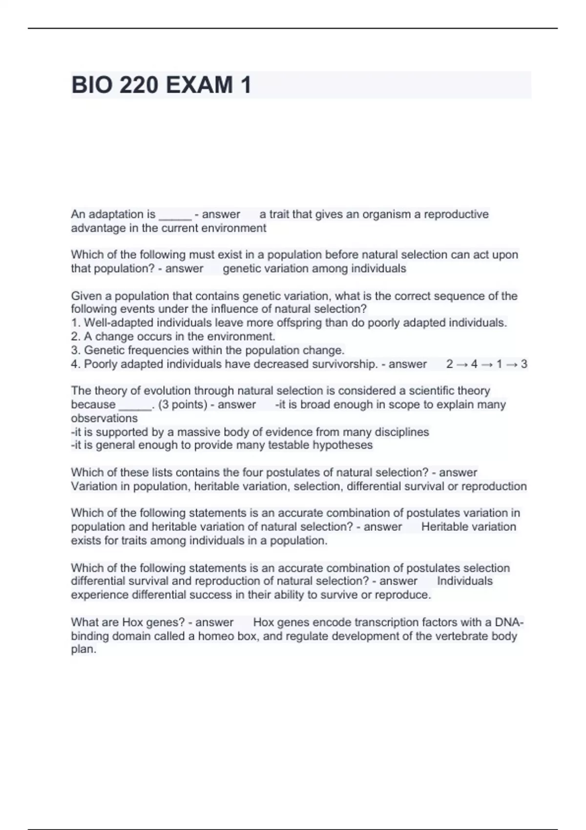 BIO 220 EXAM 2 QUESTIONS AND ANSWERS RATED A