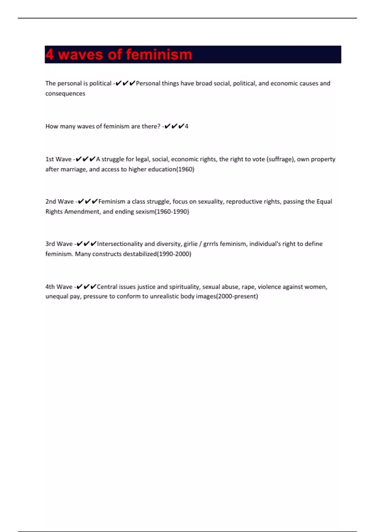 The personal is political -Personal things have broad social, political, and economic causes and consequences How many waves of feminism are there? -4 1st Wave -A struggle for legal, social, economic rights, the right to vote (suffrage), own property after marriage, and access to higher education(1960) 2nd Wave -Feminism a class struggle, focus on sexuality, reproductive rights, passing the Equal Rights Amendment, and ending sexism()