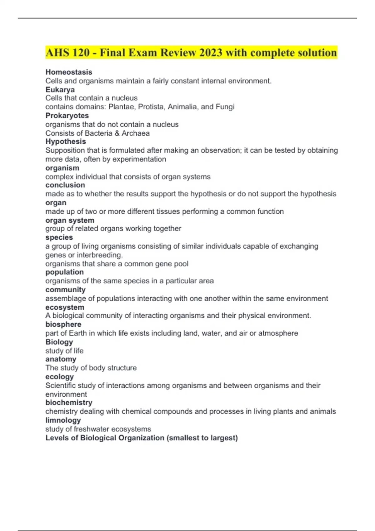 AHS 120 - Final Exam Review 2023 with complete solution Homeostasis Cells and organisms maintain a fairly constant internal environment. Eukarya Cells that contain a nucleus contains domains: Plantae, Protista, Animalia, and Fungi Prokaryotes organisms that do not contain a nucleus Consists of Bacteria & Archaea Hypothesis Supposition that is formulated after making an observation; it can be tested by obtaining more data, often by experimentation organism complex individual that consists of organ systems conclusion made as to whether the results support the hypothesis or do not support the hypothesis organ made up of two or more different tissues performing a common function organ system group of related organs working together species a group of living organisms consisting of similar individuals capable of exchanging genes or interbreeding. organisms that share a common gene pool population organisms of the same species in a particular area community assemblage of populations interacting with one another within the same environment ecosystem A biological community of interacting organisms and their physical environment. biosphere part of Earth in which life exists including land, water, and air or atmosphere Biology study of life anatomy The study of body structure ecology Scientific study of interactions among organisms and between organisms and their environment biochemistry chemistry dealing with chemical compounds and processes in living plants and animals limnology study of freshwater ecosystems Levels of Biological Organization (smallest to largest) cells tissues organs organ systems organism what membrane of the mitochondrion represents engulfing vesicles if the mitochondrion is the result of endosymbiosis? the outer mitochondrial membrane endosymbiosis A theorized process in which early eukaryotic cells were formed from simpler prokaryotes. Mitochondria Powerhouse of the cell, organelle that is the site of ATP (energy) production; has double membrane has cristae has matrix cytoplasm A jellylike fluid inside the cell in which the organelles are suspended nucleolus Found inside the nucleus and produces ribosomes organelle A tiny cell structure that carries out a specific function within the cell cytoskeleton A network of fibers that holds the cell together, helps the cell to keep its shape, and aids in movement Phospholipids present in the vesicle membrane will end up in the plasma membrane during what type of transport? exocytosis sodium-potassium pump a carrier protein that uses ATP to actively transport sodium ions out of a cell and potassium ions into the cell active transport Energy-requiring process that moves material across a cell membrane against a concentration difference passive transport the movement of substances across a cell membrane without the use of energy by the cell Ribosomes site of protein synthesis (make proteins) aerobic respiration Respiration that requires oxygen number of ATP produced in aerobic respiration 38 MAX 36 minimum 4 principle types of tissues epithelial, connective, muscular, nervous