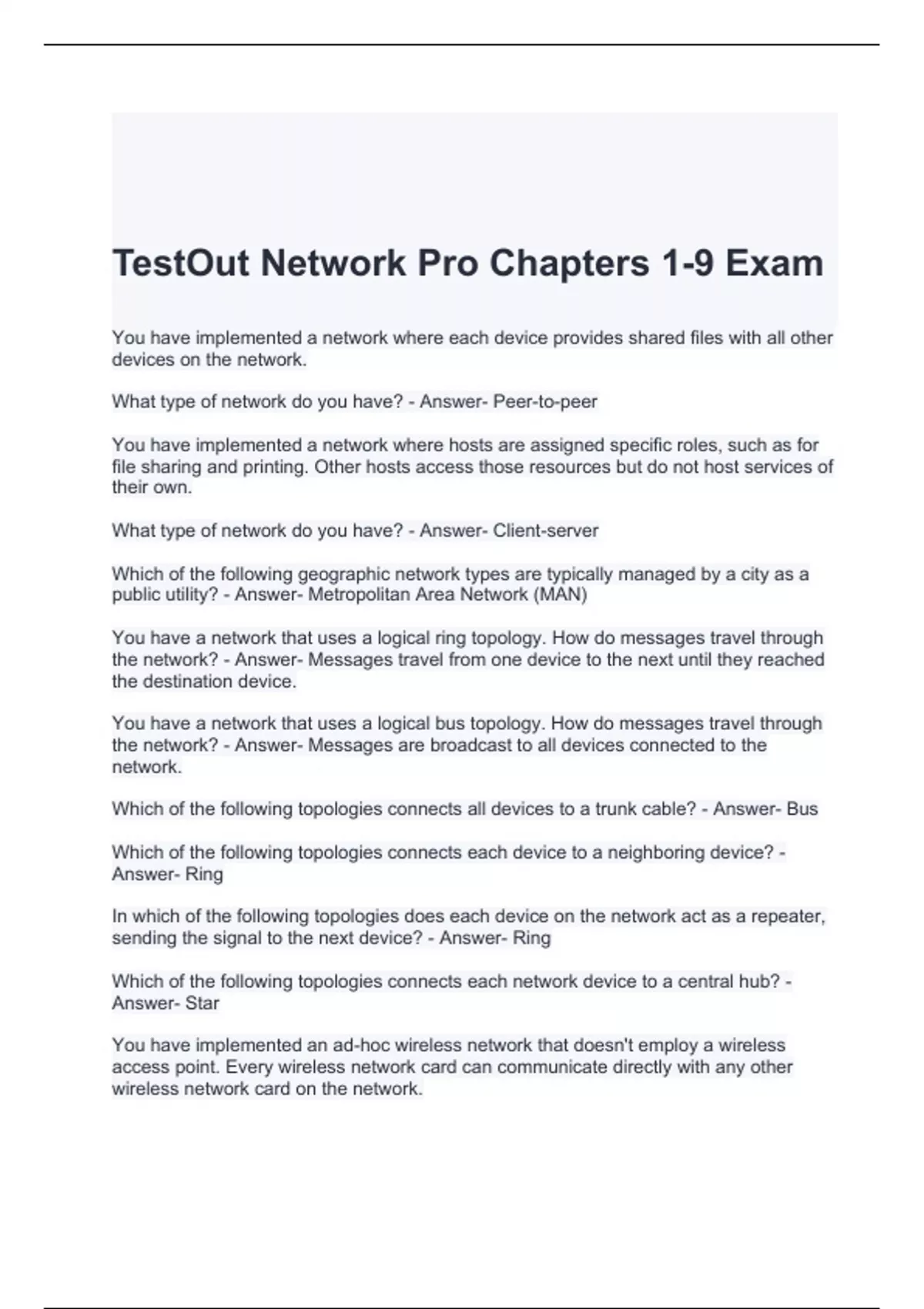 TestOut Network Pro Chapters 1-9 Exam Questions with correct Answers