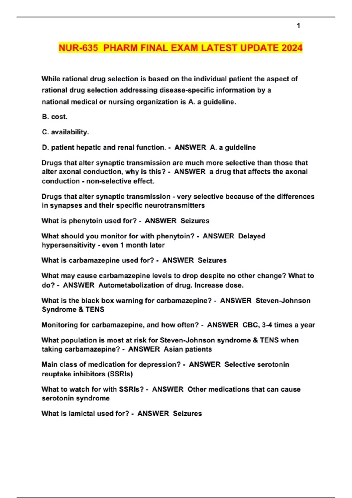 While rational drug selection is based on the individual patient the aspect of rational drug selection addressing disease-specific information by a national medical or nursing organization is A. a guideline. B. cost. C. availability. D. patient hepatic and renal function. - ANSWER A. a guideline Drugs that alter synaptic transmission are much more selective than those that alter axonal conduction, why is this? - ANSWER a drug that affects the axonal conduction - non-selective effect. Drugs that alter synaptic transmission - very selective because of the differences in synapses and their specific neurotransmitters What is phenytoin used for? - ANSWER Seizures What should you monitor for with phenytoin? - ANSWER Delayed hypersensitivity - even 1 month later What is carbamazepine used for? - ANSWER Seizures What may cause carbamazepine levels to drop despite no other change? What to do? - ANSWER Autometabolization of drug. Increase dose. What is the black box warning for carbamazepine? - ANSWER Steven-Johnson Syndrome & TENS Monitoring for carbamazepine, and how often? - ANSWER CBC, 3-4 times a year What population is most at risk for Steven-Johnson syndrome & TENS when taking carbamazepine? - ANSWER Asian patients Main class of medication for depression? - ANSWER Selective serotonin reuptake inhibitors (SSRIs) What to watch for with SSRIs? - ANSWER Other medications that can cause serotonin syndrome What is lamictal used for? - ANSWER Seizures Patient on lamictal has fever, rash, swollen lymph nodes. What are we concerned for? - ANSWER Hypersensitivity in lamictal can lead to MODS Patient on lamictal wants birth control. What do we need to change? - ANSWER Increase lamictal dose. When will pt notice improvement after starting an SSRI? - ANSWER 4 weeks later 1st line medication for moderate generalized anxiety - ANSWER Buspar (SNRI) 1st line med for classic migraines - ANSWER Triptans 2nd line treatment for classic migraines - ANSWER Prophylactic - propranolol - ANSWER Why is important that NPs have the authority to prescribe? - ANSWER Increase access to healthcare What must be done if a drug has a narrow therapeutic index? - ANSWER Frequent serum level monitoring Why would 10mg percocet or 10mg oxy work better than the other? - ANSWER Differences in pill filler composition What do medications need in order to be effective: - ANSWER Albumin (binding to) If a patient has a toxic drug level, but normal albumin, what could be happening? - ANSWER Other drugs competing for albumin What does "Sig" mean on a prescription? - ANSWER Directions to pharmacist What items are necessary on a prescription? - ANSWER Drug, dose, route, frequency, quantity, refills Abbreviations to not use - ANSWER QD What drug may cause grey teeth? - ANSWER Tetracyclines Pt reports no improvement in seizures after treatment for a few weeks. What next - ANSWER Assess drug levels for therapeutic index If patient on phenytoin wants birth control? - ANSWER Not oral contraceptives! IUD better Patient on teratogen med wants to get pregnant. When should they stop? - ANSWER Before getting pregnant, beware first trimester Pregnant pt has been taking daily aspirin. Concern for what? - ANSWER Premature close of PFO