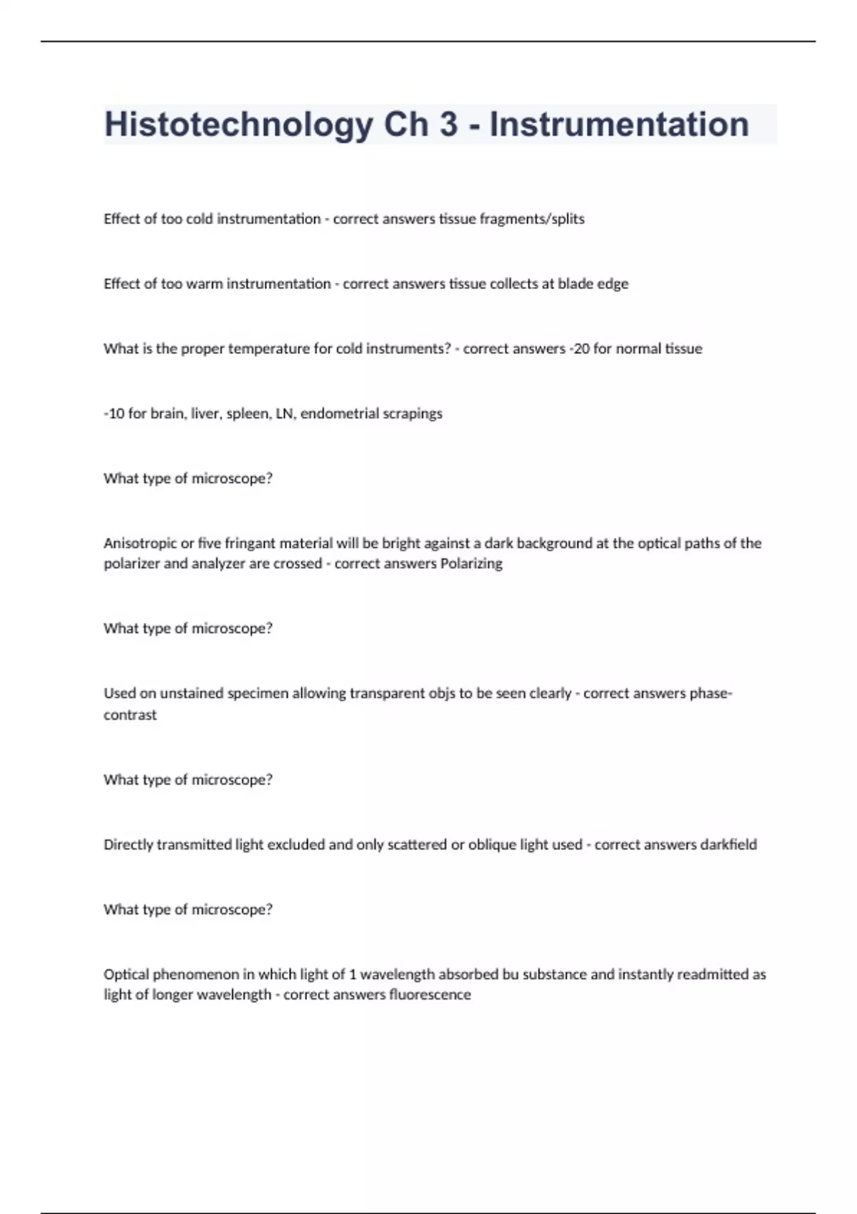 Histotechnology Ch 3 - InstrumentationEffect of too cold instrumentation - correct answers tissue fragments/splits Effect of too warm instrumentation - correct answers tissue collects at blade edge What is the proper temperature for cold instruments? - correct answers -20 for normal tissue -10 for brain, liver, spleen, LN, endometrial scrapings What type of microscope? Anisotropic or five fringant material will be bright against a dark background at the optical paths of the polarizer and analyzer are crossed - correct answers Polarizing What type of microscope? Used on unstained specimen allowing transparent objs to be seen clearly - correct answers phase-contrast What type of microscope? Directly transmitted light excluded and only scattered or oblique light used - correct answers darkfield What type of microscope?