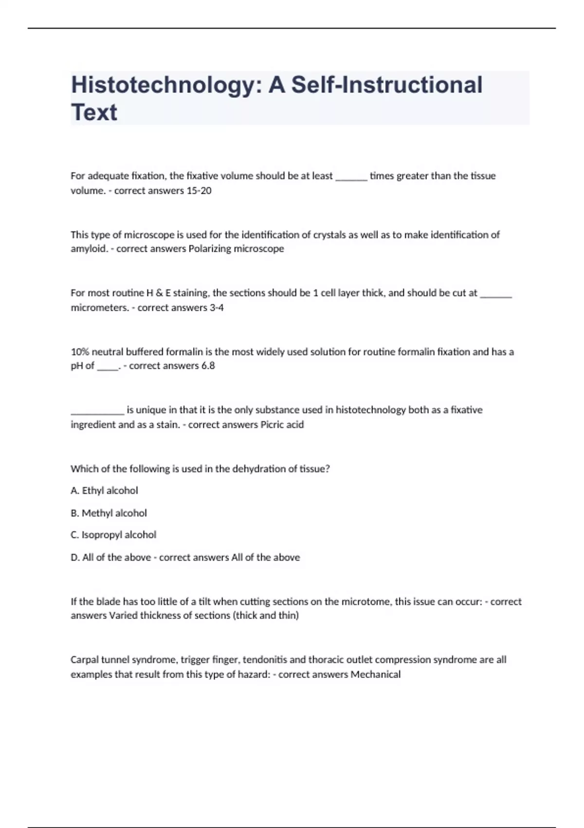 Histotechnology: A Self-Instructional TextFor adequate fixation, the fixative volume should be at least ______ times greater than the tissue volume. - correct answers 15-20 This type of microscope is used for the identification of crystals as well as to make identification of amyloid. - correct answers Polarizing microscope For most routine H & E staining, the sections should be 1 cell layer thick, and should be cut at ______ micrometers. - correct answers 3-4 10% neutral buffered formalin is the most widely used solution for routine formalin fixation and has a pH of ____. - correct answers 6.8 __________ is unique in that it is the only substance used in histotechnology both as a fixative ingredient and as a stain. - correct answers Picric acid Which of the following is used in the dehydration of tissue? A. Ethyl alcohol B. Methyl alcohol C. Isopropyl alcohol D. All of the above - correct answers All of the above If the blade has too little of a tilt when cutting sections on the microtome, this issue can occur: - correct answers Varied thickness of sections (thick and thin) Carpal tunnel syndrome, trigger finger, tendonitis and thoracic outlet compression syndrome are all examples that result from this type of hazard: - correct answers Mechanical