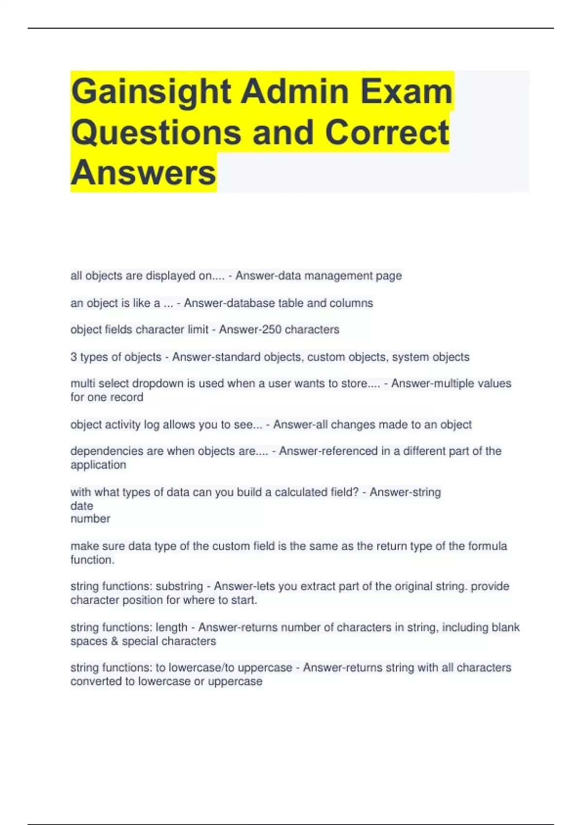 Gainsight Admin Exam Questions and Correct Answers all objects are displayed on.... - Answer-data management page an object is like a ... - Answer-database table and columns object fields character limit - Answer-250 characters 3 types of objects - Answer-standard objects, custom objects, system objects multi select dropdown is used when a user wants to store.... - Answer-multiple values for one record object activity log allows you to see... - Answer-all changes made to an object dependencies are when objects are.... - Answer-referenced in a different part of the application with what types of data can you build a calculated field? - Answer-string date number make sure data type of the custom field is the same as the return type of the formula function. string functions: substring - Answer-lets you extract part of the original string. provide character position for where to start. string functions: length - Answer-returns number of characters in string, including blank spaces & special characters string functions: to lowercase/to uppercase - Answer-returns string with all characters converted to lowercase or uppercase string functions: string position - Answer-returns position of first character of substring in main string string functions: left string/right string - Answer-extracts substring from main string, must supply # of characters to be included starting from the left or right string functions: concat. how many arguments are allowed? - Answer-adds two strings together, provide delimeter between two (comma, hypen or space) 10 arguments are allowed date functions: date diff - Answer-subtracts one date from another in certain interval. can be days, months, quarters, weeks, years. negative number result if applicable. date functions: date add/sub dynamic fields? - Answer-adds/subtracts # of days, weeks, months, or quarters to given date. provide: date, #, interval for number (day, quarter, month, week) accepts dynamic fields. The number of days you add to or subtract from a date dynamically changes with the value of the selected field. date functions: First Day of Week/Last Day of Week - Answer-accepts date and returns date on which the week started/ended. monday considered start of week, sunday considered end of week. date functions: Last Day of Quarter - Answer-accepts date and returns date on which the quarter ended (last date of quarter) date functions: Month Num - Answer-returns number of month to which date belongs (april = 4) date functions: Month Name - Answer-returns name of the month for a given date. can selected format. April, Apr etc date functions: Week Num - Answer-returns number of week in year for a given date. date functions: Week in Month - Answer-returns number of week in a month for a given date date functions: Year Num - Answer-returns the year to which a date belongs date functions: Day Of - Answer-returns day of the week for a certain date date functions: First or Last Day Of Month/Quarter/Year - Answer-returns date on which month/quarter/year began or ended for a certain date object graphs show.... - Answer-joins between two objects. pictorial representation of what would happen if a record is deleted. 4 data store types in MDA - Answer-AWS Redshift, MongoDB, Postgres, Redis What is stored in AWS Redshift - Answer-primary bulk data store, holds all actual data valued stored in MDA What is stored in MongoDB - Answer-stores scheme/metadata for tables in Redshift what is stored in postgres - Answer-transactional type data - used in scorecards, programs what is stored in redis - Answer-cache session data mda joins can be done on what types of object combinations? - Answer-2 standard, 2 custom, standard to custom and vice versa what does a join accomplish? - Answer-allows you to join data from 2 objects to generate reports or create rules on these objects what 3 conditions must be applied to create a join? - Answer-1) in data management page, objects should have "joins allowed" as true 2) lookup relation between objects can only be defined on GSID, string and email email data type fields 3) must be one field that is an external identifier to your company data in GS that will allow you to tie together external & GS data when you apply lookup relation, what is the default? - Answer-LEFT OUTER JOIN, performed on base collection (whichever one is selected at data source)