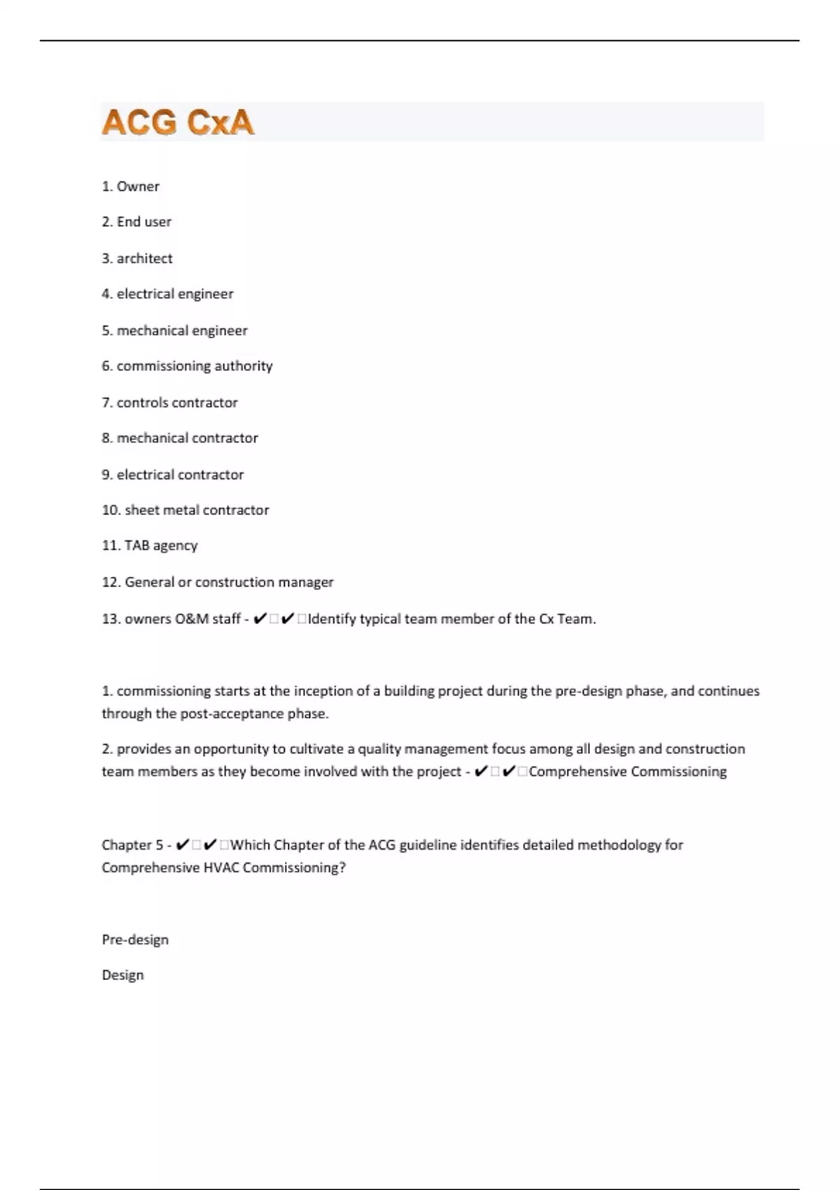 1. Owner 2. End user 3. architect 4. electrical engineer 5. mechanical engineer 6. commissioning authority 7. controls contractor 8. mechanical contractor 9. electrical contractor 10. sheet metal contractor 11. TAB agency 12. General or construction manager 13. owners O&M staff - ️️Identify typical team member of the Cx Team. 1. commissioning starts at the inception of a building project during the pre-design phase, and continues through the post-acceptance phase. 2. provides an opportunity to cultivate a quality management focus among all design and construction team members as they become involved with the project - ️️Comprehensive Commissioning Chapter 5 - ️️Which Chapter of the ACG guideline identifies detailed methodology for Comprehensive HVAC Commissioning? Pre-design Design