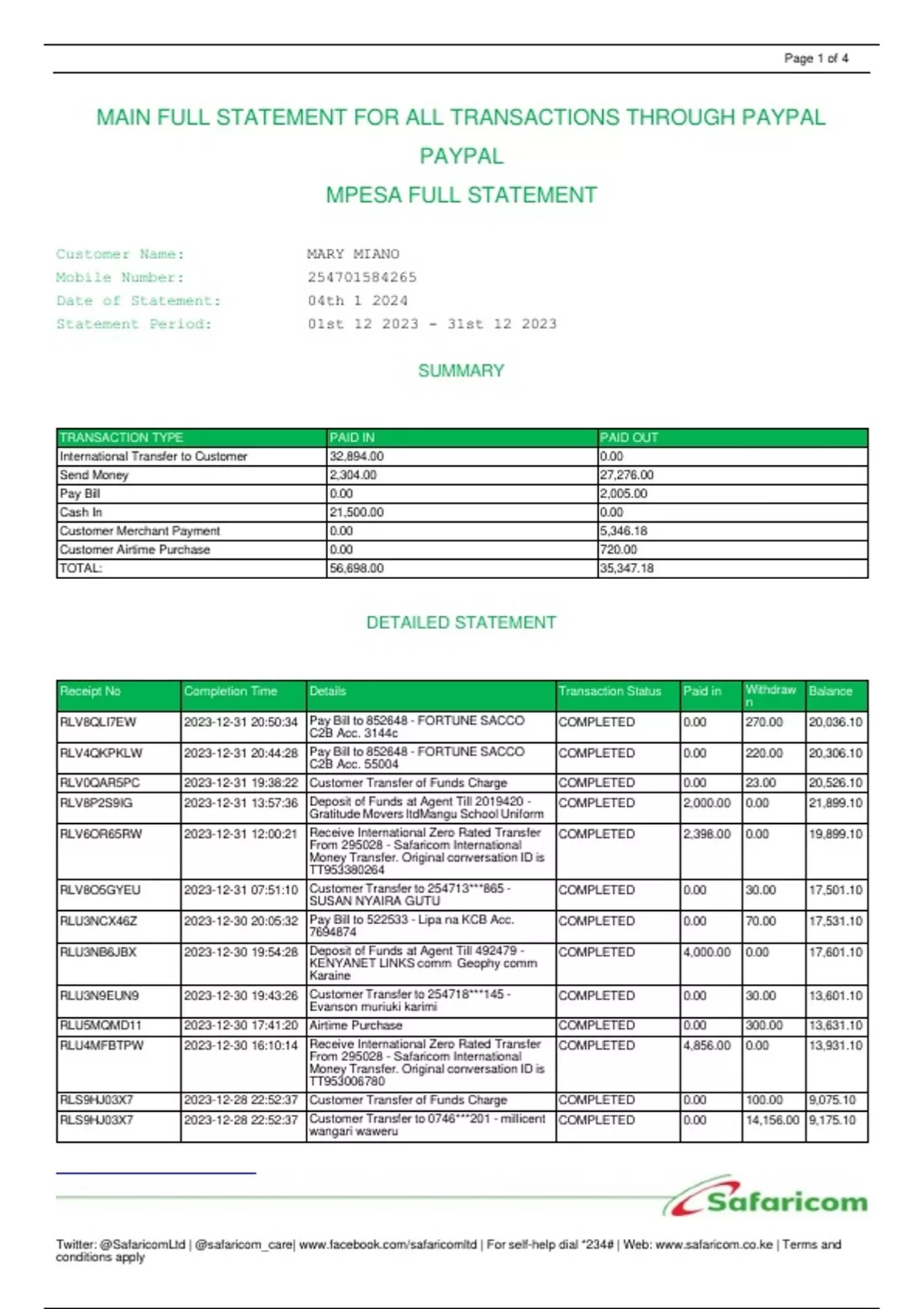 MAIN FULL STATEMENT FOR ALL TRANSACTIONS THROUGH PAYPAL PAYPAL MPESA FULL STATEMENT Customer Name: MARY MIANO Mobile Number: Date of Statement: 04th 1 2024 Statement Period: 01st st 12 2023 SUMMARY TRANSACTION TYPE PAID IN PAID OUT International Transfer to Customer 32,894.00 0.00 Send Money 2,304.00 27,276.00 Pay Bill 0.00 2,005.00 Cash In 21,500.00 0.00 Customer Merchant Payment 0.00 5,346.18 Customer Airtime Purchase 0.00 720.00 TOTAL: 56,698.00 35,347.18 DETAILED STATEMENT Receipt No Completion Time Details Transaction Status Paid in Withdraw n Balance RLV8QLI7EW :50:34 Pay Bill to 852648 - FORTUNE SACCO C2B Acc. 3144c COMPLETED 0.00 270.00 20,036.10 RLV4QKPKLW :44:28 Pay Bill to 852648 - FORTUNE SACCO C2B Acc. 55004 COMPLETED 0.00 220.00 20,306.10 RLV0QAR5PC 2023-12-31 19:38:22 Customer Transfer of Funds Charge COMPLETED 0.00 23.00 20,526.10 RLV8P2S9IG :57:36 Deposit of Funds at Agent Till 2019420 - Gratitude Movers ltdMangu School Uniform COMPLETED 2,000.00 0.00 21,899.10 RLV6OR65RW :00:21 Receive International Zero Rated Transfer From 295028 - Safaricom International Money Transfer. Original conversation ID is TT COMPLETED 2,398.00 0.00 19,899.10 RLV8O5GYEU :51:10 Customer Transfer to 254713***865 - SUSAN NYAIRA GUTU COMPLETED 0.00 30.00 17,501.10 RLU3NCX46Z :05:32 Pay Bill to 522533 - Lipa na KCB Acc. 7694874 COMPLETED 0.00 70.00 17,531.10 RLU3NB6JBX :54:28 Deposit of Funds at Agent Till 492479 - KENYANET LINKS comm Geophy comm Karaine COMPLETED 4,000.00 0.00 17,601.10 RLU3N9EUN9 :43:26 Customer Transfer to 254718***145 - Evanson muriuki karimi COMPLETED 0.00 30.00 13,601.10 RLU5MQMD:41:20 Airtime Purchase COMPLETED 0.00 300.00 13,631.10 RLU4MFBTPW :10:14 Receive International Zero Rated Transfer From 295028 - Safaricom International Money Transfer. Original conversation ID is TT COMPLETED 4,856.00 0.00 13,931.10 RLS9HJ03X:52:37 Customer Transfer of Funds Charge COMPLETED 0.00 100.00 9,075.10 RLS9HJ03X:52:37 Customer Transfer to 0746***201 - millicent wangari waweru COMPLETED 0.00 14,156.00 9,175.10 Page 2 of 4 Twitter: @SafaricomLtd | @safaricom_care| conditions apply Disclaimer: This record is produced for your personal use and is not transferable. If this record is sought to be produced in court, please contact the nearest retail shop for further guidance or send an email to Safaricom Customer Care via Page 3 of 4 Twitter: @SafaricomLtd | @safaricom_care| conditions apply Receipt No Completion Time Details Transaction Status Paid in Withdraw n Balance RLS6HIWAEA :50:21 Receive International Zero Rated Transfer From 295028 - Safaricom International Money Transfer. Original conversation ID is TT COMPLETED 16,574.00 0.00 23,331.10 RLS2HBWBV:21:00 Airtime Purchase COMPLETED 0.00 20.00 6,757.10 RLS3FXULKT :52:09 Pay Bill Charge COMPLETED 0.00 5.00 6,777.10 RLS3FXULKT :52:09 Pay Bill to 804040 - M-GAS LIMITED Acc. R8361193 COMPLETED 0.00 350.00 6,782.10 RLS9ESZ8JF :02:57 Merchant Payment to 7169024 - ROSE WAMUYU COMPLETED 0.00 200.00 7,132.10 RLR9E43IX:25:57 Customer Transfer to 0796***800 - jenniffer muthoni mbeti COMPLETED 0.00 70.00 7,332.10 RLR4DGX94E :47:07 Airtime Purchase COMPLETED 0.00 100.00 7,402.10 RLR7D4ROHR :59:26 Customer Transfer of Funds Charge COMPLETED 0.00 13.00 7,502.10 RLR7D4ROHR :59:26 Customer Transfer to 0741***865 - mary wairimu muthoni COMPLETED 0.00 1,000.00 7,515.10 RLR9CXJNMZ :49:54 Customer Transfer to 254720***998 - JULIUS MURIITHI MURIUKI COMPLETED 0.00 60.00 8,515.10 RLR2CSWMAI :05:22 Customer Transfer of Funds Charge COMPLETED 0.00 7.00 8,575.10 RLR2CSWMAI :05:22 Customer Transfer to 0115***711 - Eunice Wangeci Karimi COMPLETED 0.00 250.00 8,582.10 RLR8CQPIFC :44:31 Funds received from 0746***201 - millicent wangari waweru COMPLETED 200.00 0.00 8,832.10 RLR9C0CU1J :23:33 Funds received from 0746***201 - millicent wangari waweru COMPLETED 1,200.00 0.00 8,632.10 RLQ1AZBK:30:19 Pay Merchant Charge COMPLETED 0.00 1.18 7,432.10 RLQ1AZBK:30:19 Merchant Payment to 7164553 - CONNECT TWO FOUR SEVEN ENERGY LTD 2 COMPLETED 0.00 215.00 7,433.28 RLQ8AU0BRA :54:15 Merchant Payment to 988186 - EMMARTEX HAVEN HOTEL COMPLETED 0.00 1,250.00 7,648.28 RLQ7A9FFUN :51:59 Customer Transfer to 0797***397 - joyce Wanjiru nyaga COMPLETED 0.00 200.00 8,905.28 RLQ7A9FFUN :51:59 Customer Transfer of Funds Charge COMPLETED 0.00 7.00 8,898.28 RLQ798GOW:19:29 Customer Transfer to 0793***431 - Idah Njeri Muriithi COMPLETED 0.00 1,620.00 9,138.28 RLQ798GOW:19:29 Customer Transfer of Funds Charge COMPLETED 0.00 33.00 9,105.28 RLP98JMJ9H :01:17 Customer Transfer of Funds Charge COMPLETED 0.00 7.00 10,758.28 RLP98JMJ9H :01:17 Customer Transfer to 254798***487 - Lucy waruguru karuri COMPLETED 0.00 250.00 10,765.28 RLP4802X:20:51 Pay Bill to 852648 - FORTUNE SACCO C2B Acc. 55004 COMPLETED 0.00 120.00 11,015.28 RLP17ZCCOL :14:28 Customer Transfer of Funds Charge COMPLETED 0.00 7.00 11,135.28 RLP17ZCCOL :14:28 Customer Transfer to 254702***736 - Mary WANJIRU Muriithi COMPLETED 0.00 200.00 11,142.28 RLP97SFBQ:10:45 Airtime Purchase COMPLETED 0.00 150.00 11,342.28 RLP47RX46W :06:06 Pay Bill to 852648 - FORTUNE SACCO C2B Acc. 3144c COMPLETED 0.00 250.00 11,492.28 RLP87QGW:52:05 Pay Bill to 852648 - FORTUNE SACCO C2B Acc. 3144c COMPLETED 0.00 720.00 11,742.28 RLP27P85P:40:15 Merchant Payment to 7136175 - PEAK VIEW BAR 002 4 COMPLETED 0.00 680.00 12,462.28 RLP178UZ:01:11 Customer Transfer to 0701***850 - brenda wambeti nyamu COMPLETED 0.00 90.00 13,142.28 RLP073LMUW :11:54 Merchant Payment to 154413 - THE PLACE BAR MUGWANDI COMPLETED 0.00 800.00 13,232.28 RLP26ZIVDY :35:05 Merchant Payment to 154413 - THE PLACE BAR MUGWANDI COMPLETED 0.00 560.00 14,032.28 RLP76WG3AZ :07:23 Customer Transfer to 0758***021 - ann muthoni muthii COMPLETED 0.00 70.00 14,592.28 RLP26QX9NK 2023-12-25 11:17:55 Customer Transfer to 254728***799 - JOHN KORO COMPLETED 0.00 100.00 14,662.28