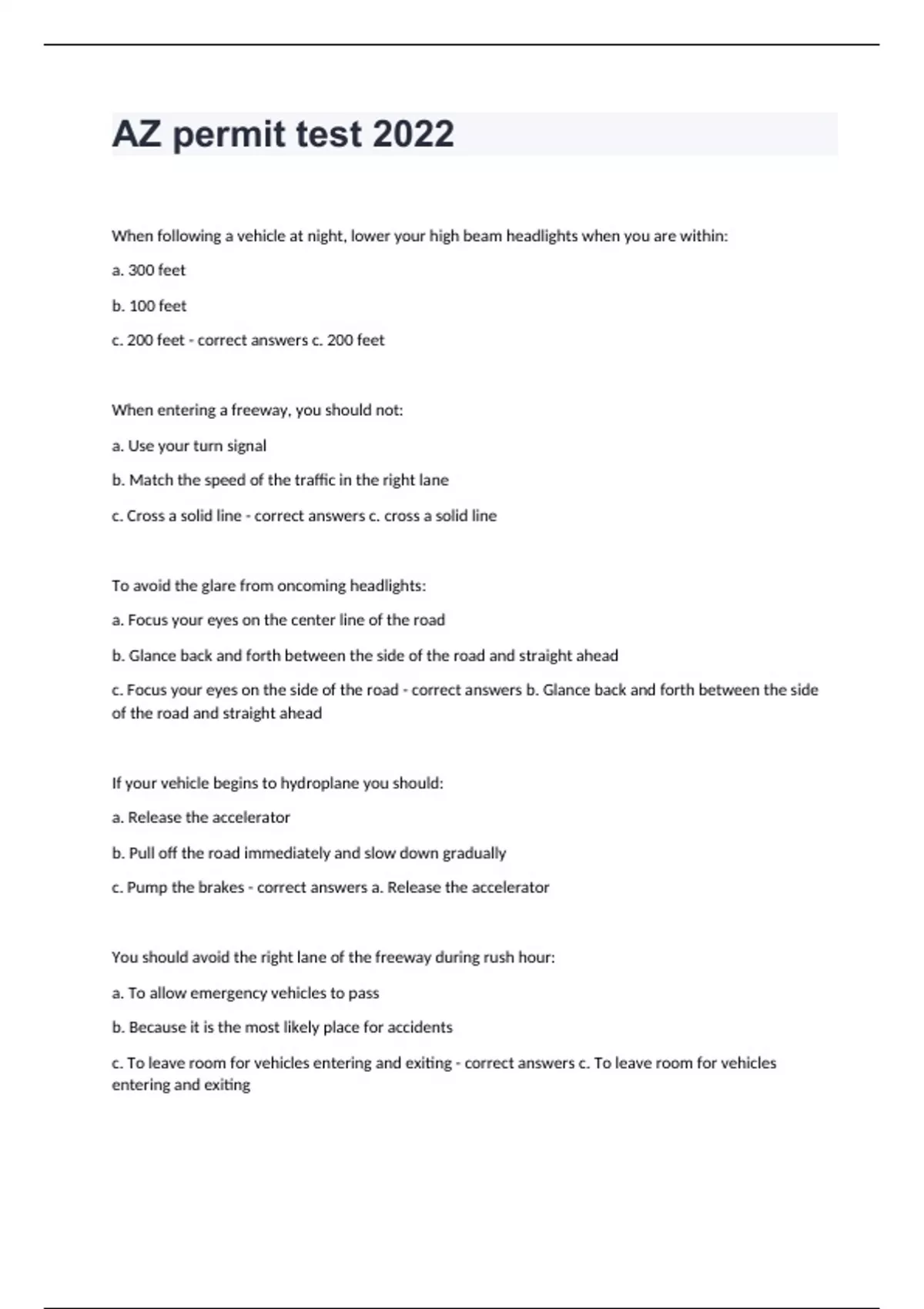 AZ permit test 2022When following a vehicle at night, lower your high beam headlights when you are within: a. 300 feet b. 100 feet c. 200 feet - correct answers c. 200 feet When entering a freeway, you should not: a. Use your turn signal b. Match the speed of the traffic in the right lane c. Cross a solid line - correct answers c. cross a solid line To avoid the glare from oncoming headlights: a. Focus your eyes on the center line of the road b. Glance back and forth between the side of the road and straight ahead c. Focus your eyes on the side of the road - correct answers b. Glance back and forth between the side of the road and straight ahead If your vehicle begins to hydroplane you should: a. Release the accelerator b. Pull off the road immediately and slow down gradually c. Pump the brakes - correct answers a. Release the accelerator You should avoid the right lane of the freeway during rush hour: a. To allow emergency vehicles to pass b. Because it is the most likely place for accidents c. To leave room for vehicles entering and exiting - correct answers c. To leave room for vehicles entering and exiting