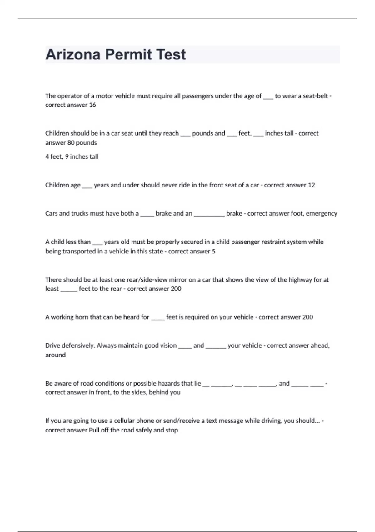 Arizona Permit TestThe operator of a motor vehicle must require all passengers under the age of ___ to wear a seat-belt - correct answer 16 Children should be in a car seat until they reach ___ pounds and ___ feet, ___ inches tall - correct answer 80 pounds 4 feet, 9 inches tall Children age ___ years and under should never ride in the front seat of a car - correct answer 12 Cars and trucks must have both a ____ brake and an _________ brake - correct answer foot, emergency A child less than ___ years old must be properly secured in a child passenger restraint system while being transported in a vehicle in this state - correct answer 5 There should be at least one rear/side-view mirror on a car that shows the view of the highway for at least _____ feet to the rear - correct answer 200 A working horn that can be heard for ____ feet is required on your vehicle - correct answer 200 Drive defensively. Always maintain good vision ____ and ______ your vehicle - correct answer ahead, around Be aware of road conditions or possible hazards that lie __ ______, __ ____ _____, and _____ ____ - correct answer in front, to the sides, behind you If you are going to use a cellular phone or send/receive a text message while driving, you should... - correct answer Pull off the road safely and stop