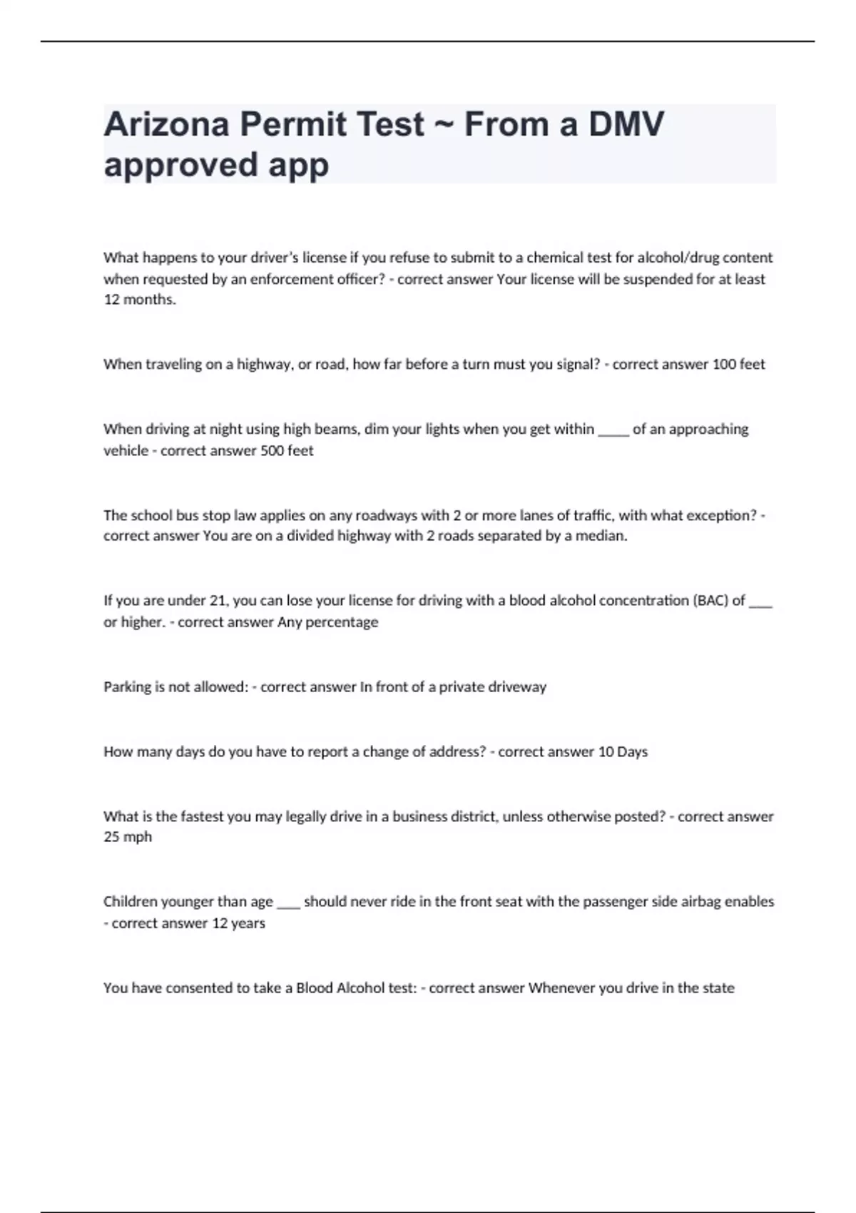Arizona Permit Test ~ From a DMV approved appWhat happens to your driver’s license if you refuse to submit to a chemical test for alcohol/drug content when requested by an enforcement officer? - correct answer Your license will be suspended for at least 12 months. When traveling on a highway, or road, how far before a turn must you signal? - correct answer 100 feet When driving at night using high beams, dim your lights when you get within ____ of an approaching vehicle - correct answer 500 feet The school bus stop law applies on any roadways with 2 or more lanes of traffic, with what exception? - correct answer You are on a divided highway with 2 roads separated by a median. If you are under 21, you can lose your license for driving with a blood alcohol concentration (BAC) of ___ or higher. - correct answer Any percentage Parking is not allowed: - correct answer In front of a private driveway How many days do you have to report a change of address? - correct answer 10 Days What is the fastest you may legally drive in a business district, unless otherwise posted? - correct answer 25 mph Children younger than age ___ should never ride in the front seat with the passenger side airbag enables - correct answer 12 years You have consented to take a Blood Alcohol test: - correct answer Whenever you drive in the state