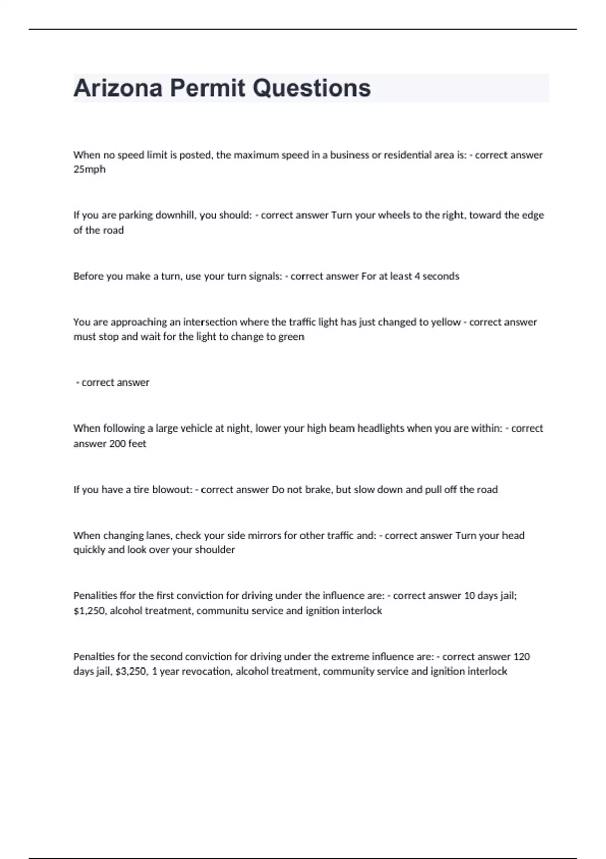 Arizona Permit Questions When no speed limit is posted, the maximum speed in a business or residential area is: - correct answer 25mph If you are parking downhill, you should: - correct answer Turn your wheels to the right, toward the edge of the road Before you make a turn, use your turn signals: - correct answer For at least 4 seconds You are approaching an intersection where the traffic light has just changed to yellow - correct answer must stop and wait for the light to change to green - correct answer When following a large vehicle at night, lower your high beam headlights when you are within: - correct answer 200 feet If you have a tire blowout: - correct answer Do not brake, but slow down and pull off the road When changing lanes, check your side mirrors for other traffic and: - correct answer Turn your head quickly and look over your shoulder Penalities ffor the first conviction for driving under the influence are: - correct answer 10 days jail; $1,250, alcohol treatment, communitu service and ignition interlock Penalties for the second conviction for driving under the extreme influence are: - correct answer 120 days jail, $3,250, 1 year revocation, alcohol treatment, community service and ignition interlock
