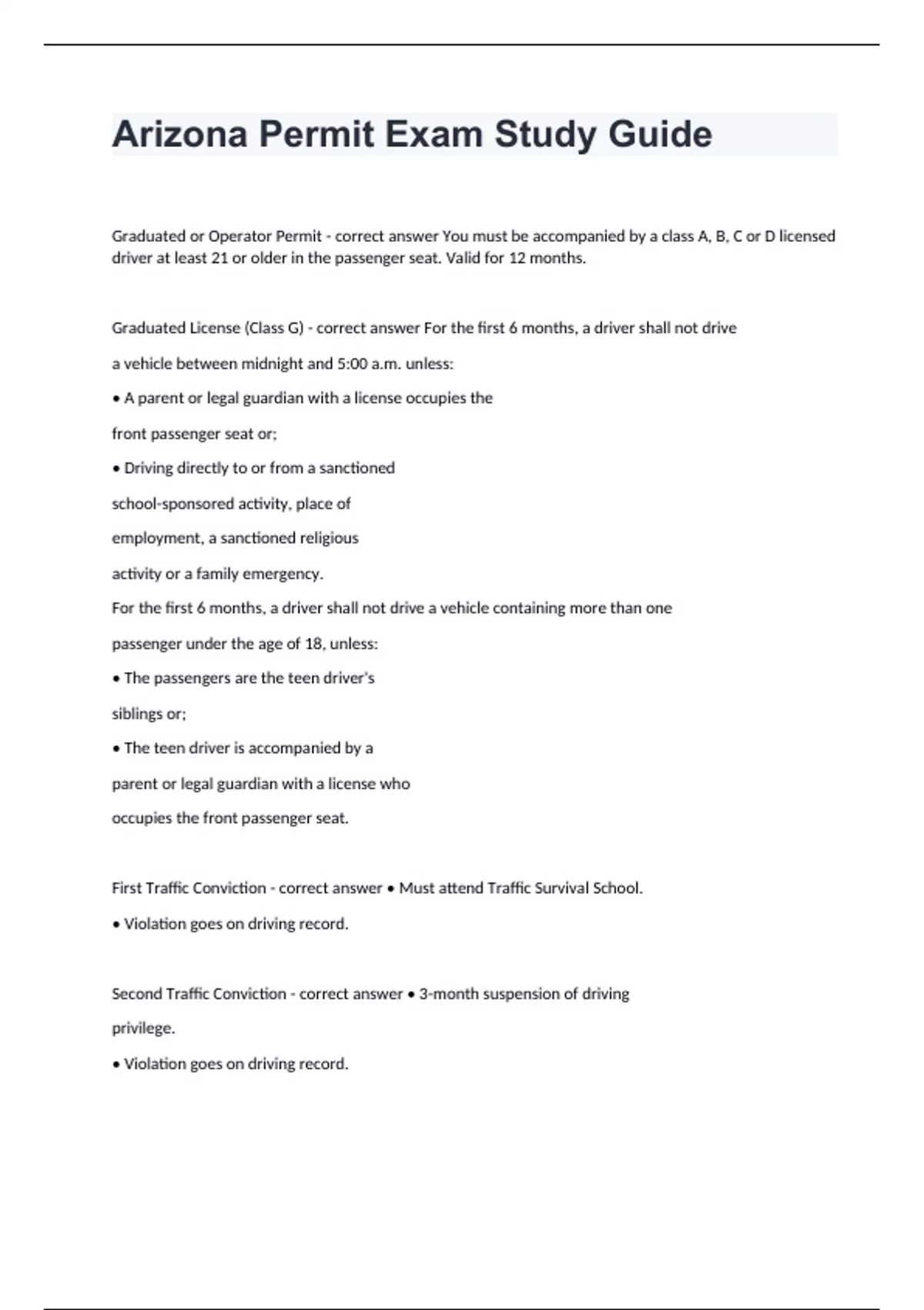 Arizona Permit Exam Study GuideGraduated or Operator Permit - correct answer You must be accompanied by a class A, B, C or D licensed driver at least 21 or older in the passenger seat. Valid for 12 months. Graduated License (Class G) - correct answer For the first 6 months, a driver shall not drive a vehicle between midnight and 5:00 a.m. unless: • A parent or legal guardian with a license occupies the front passenger seat or; • Driving directly to or from a sanctioned school-sponsored activity, place of employment, a sanctioned religious activity or a family emergency. For the first 6 months, a driver shall not drive a vehicle containing more than one passenger under the age of 18, unless: • The passengers are the teen driver's siblings or; • The teen driver is accompanied by a parent or legal guardian with a license who occupies the front passenger seat. First Traffic Conviction - correct answer • Must attend Traffic Survival School. • Violation goes on driving record. Second Traffic Conviction - correct answer • 3-month suspension of driving privilege. • Violation goes on driving record.