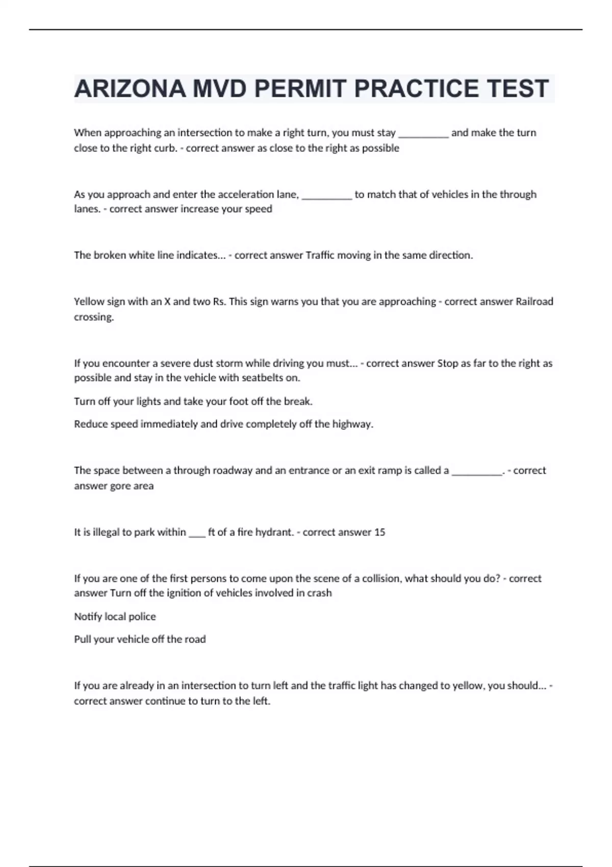 ARIZONA MVD PERMIT PRACTICE TESTWhen approaching an intersection to make a right turn, you must stay _________ and make the turn close to the right curb. - correct answer as close to the right as possible As you approach and enter the acceleration lane, _________ to match that of vehicles in the through lanes. - correct answer increase your speed The broken white line indicates... - correct answer Traffic moving in the same direction. Yellow sign with an X and two Rs. This sign warns you that you are approaching - correct answer Railroad crossing. If you encounter a severe dust storm while driving you must... - correct answer Stop as far to the right as possible and stay in the vehicle with seatbelts on. Turn off your lights and take your foot off the break. Reduce speed immediately and drive completely off the highway. The space between a through roadway and an entrance or an exit ramp is called a _________. - correct answer gore area It is illegal to park within ___ ft of a fire hydrant. - correct answer 15 If you are one of the first persons to come upon the scene of a collision, what should you do? - correct answer Turn off the ignition of vehicles involved in crash Notify local police Pull your vehicle off the road If you are already in an intersection to turn left and the traffic light has changed to yellow, you should... - correct answer continue to turn to the left.