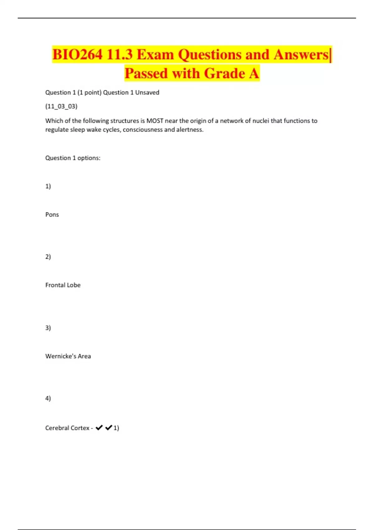 Question 1 (1 point) Question 1 Unsaved (11_03_03) Which of the following structures is MOST near the origin of a network of nuclei that functions to regulate sleep wake cycles, consciousness and alertness. Question 1 options: 1) Pons 2) Frontal Lobe 3) Wernicke's Area 4) Cerebral Cortex -1)