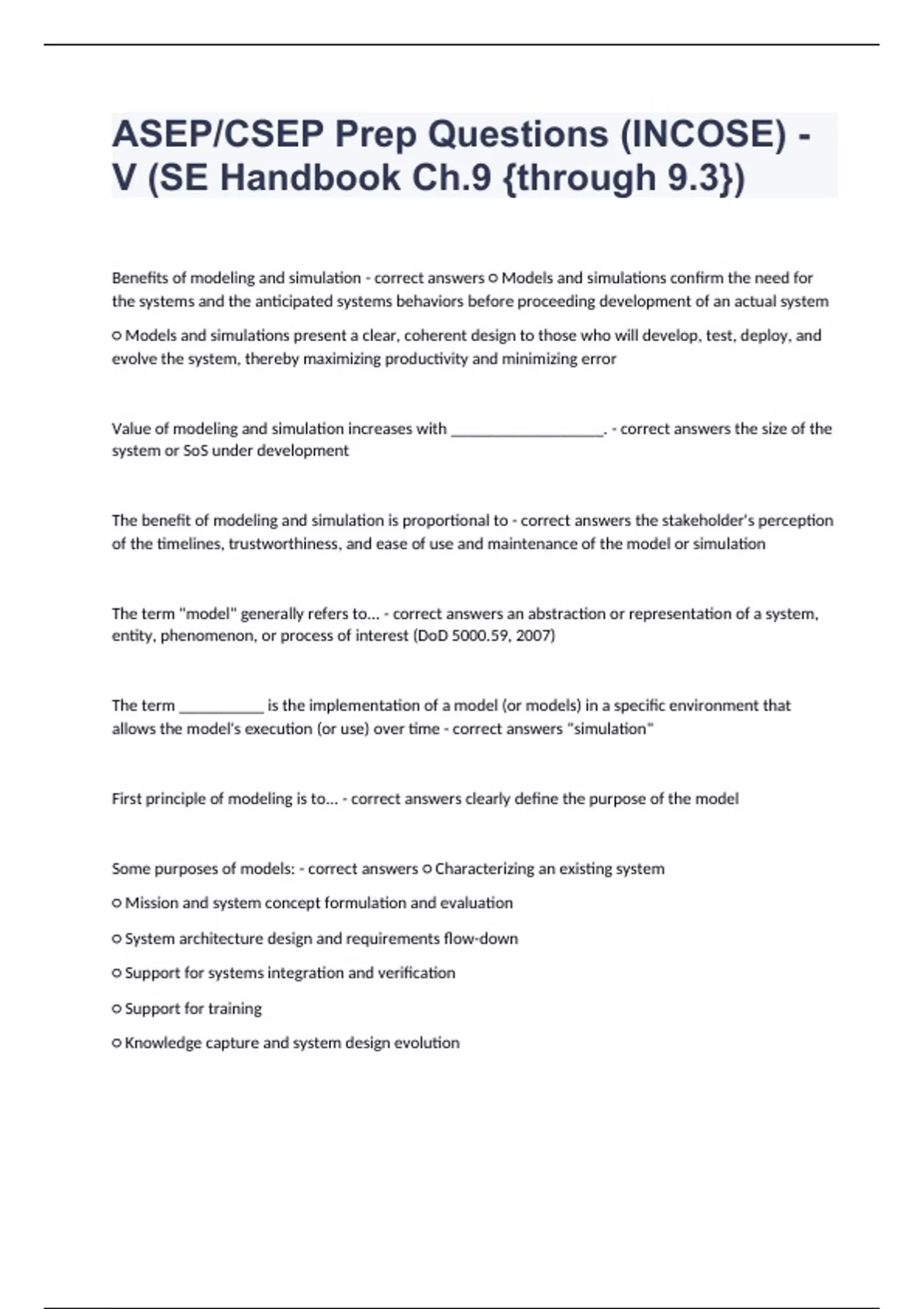 ASEP/CSEP Prep Questions (INCOSE) - V (SE Handbook Ch.9 {through 9.3})Benefits of modeling and simulation - correct answers ○ Models and simulations confirm the need for the systems and the anticipated systems behaviors before proceeding development of an actual system ○ Models and simulations present a clear, coherent design to those who will develop, test, deploy, and evolve the system, thereby maximizing productivity and minimizing error Value of modeling and simulation increases with __________________. - correct answers the size of the system or SoS under development The benefit of modeling and simulation is proportional to - correct answers the stakeholder's perception of the timelines, trustworthiness, and ease of use and maintenance of the model or simulation The term "model" generally refers to... - correct answers an abstraction or representation of a system, entity, phenomenon, or process of interest (DoD 5000.59, 2007) The term __________ is the implementation of a model (or models) in a specific environment that allows the model's execution (or use) over time - correct answers "simulation" First principle of modeling is to... - correct answers clearly define the purpose of the model Some purposes of models: - correct answers ○ Characterizing an existing system ○ Mission and system concept formulation and evaluation ○ System architecture design and requirements flow-down ○ Support for systems integration and verification ○ Support for training ○ Knowledge capture and system design evolution