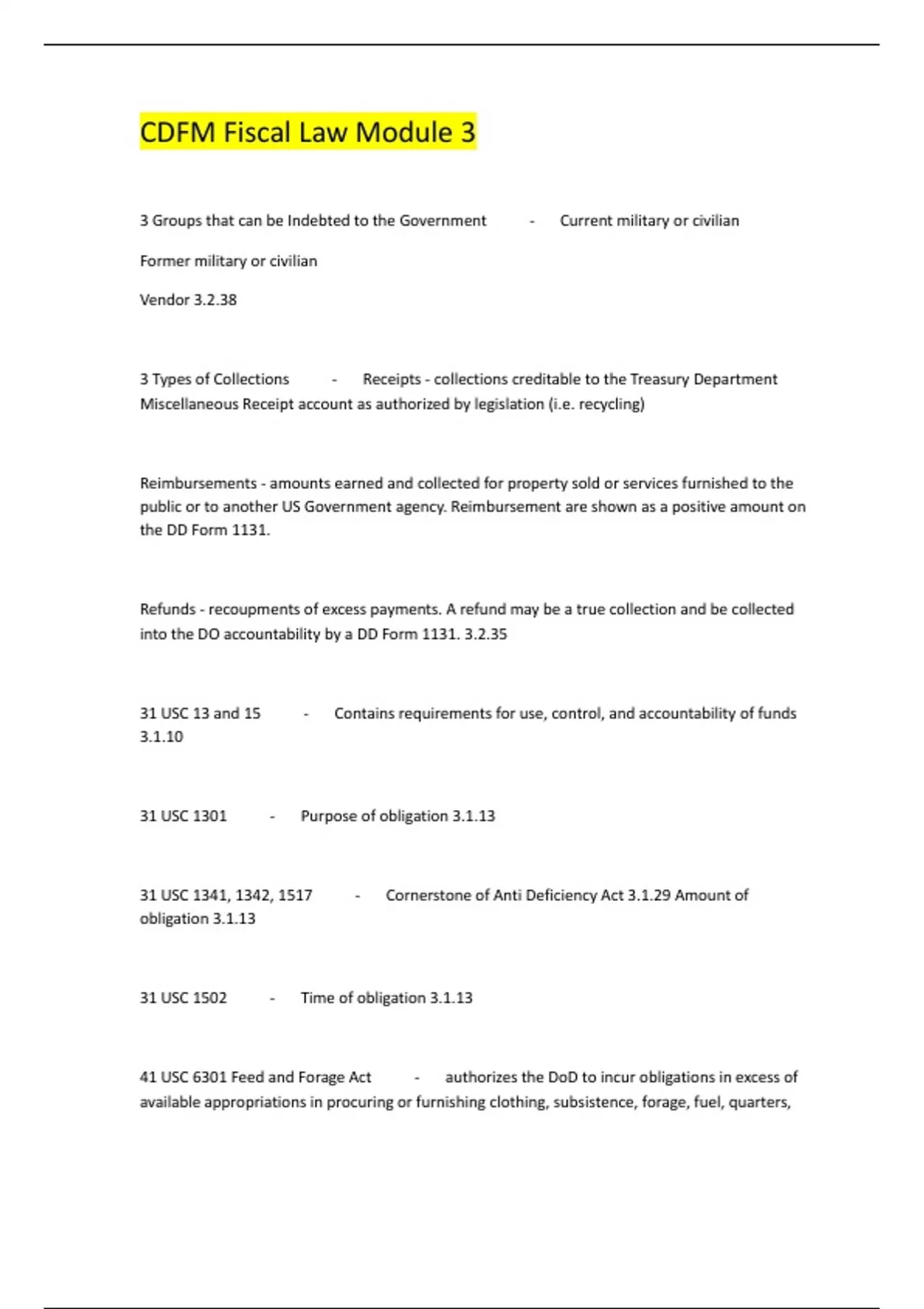 3 Groups that can be Indebted to the Government - Current military or civilian Former military or civilian Vendor 3.2.38 3 Types of Collections - Receipts - collections creditable to the Treasury Department Miscellaneous Receipt account as authorized by legislation (i.e. recycling) Reimbursements - amounts earned and collected for property sold or services furnished to the public or to another US Government agency. Reimbursement are shown as a positive amount on the DD Form 1131. Refunds - recoupments of excess payments. A refund may be a true collection and be collected into the DO accountability by a DD Form 1131. 3.2.35 31 USC 13 and 15 - Contains requirements for use, control, and accountability of funds 3.1.10 31 USC 1301 - Purpose of obligation 3.1.13 31 USC 1341, 1342, 1517 - Cornerstone of Anti Deficiency Act 3.1.29 Amount of obligation 3.1.13 31 USC 1502 - Time of obligation 3.1.13