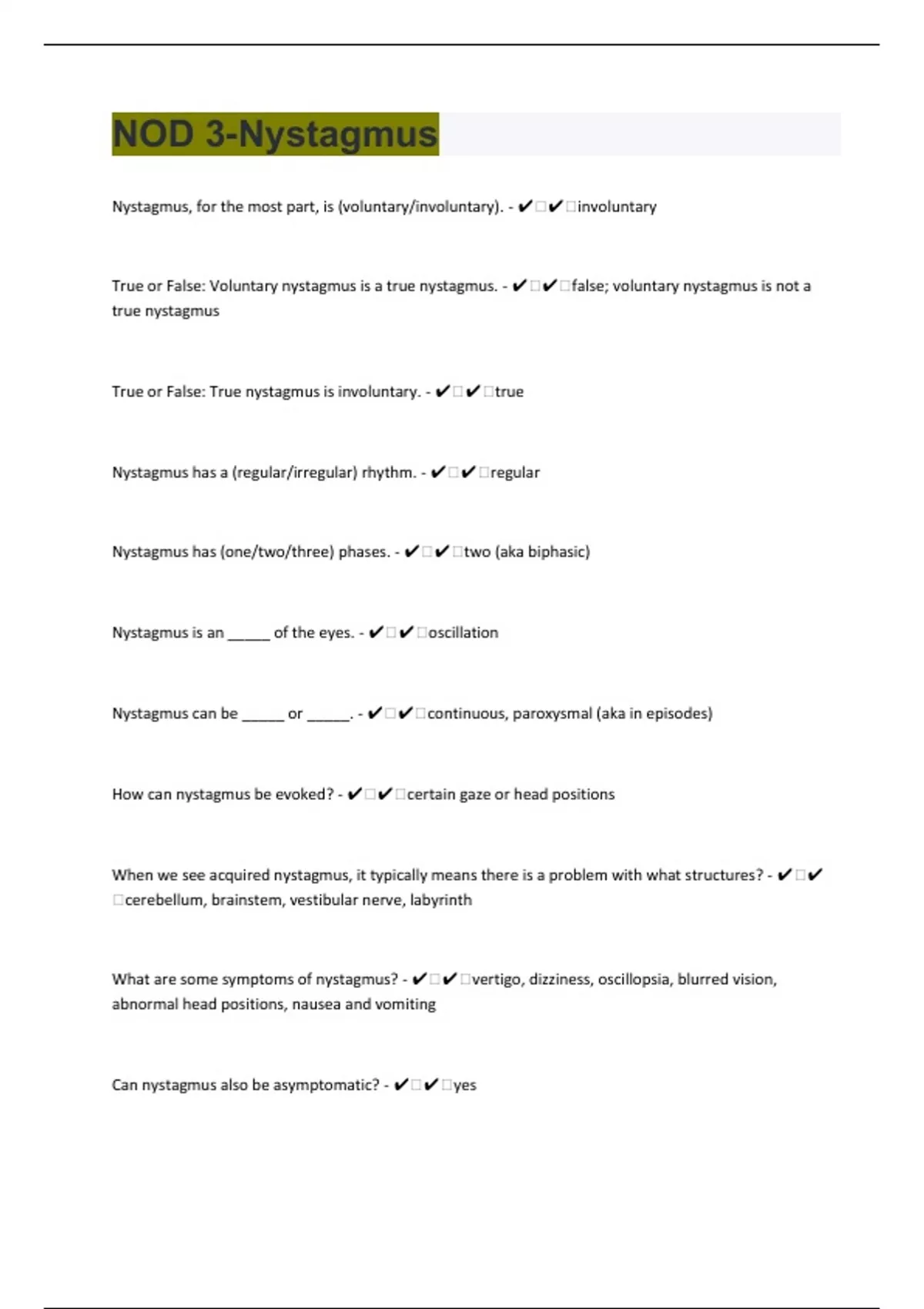 NOD 3- Nystagmus 123 Questions with 100% Correct Answers | Verified | Latest Update