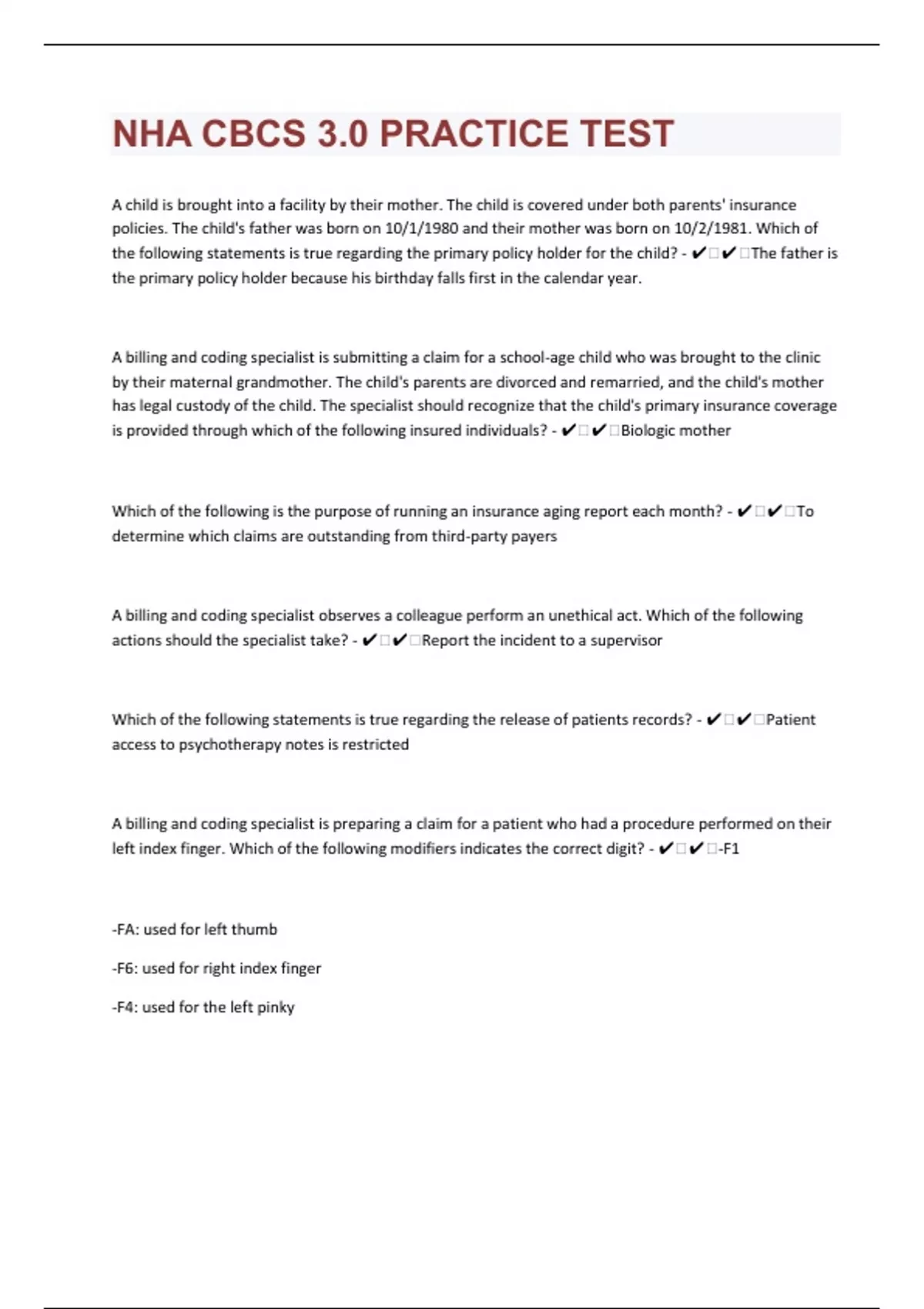 A child is brought into a facility by their mother. The child is covered under both parents' insurance policies. The child's father was born on 10/1/1980 and their mother was born on 10/2/1981. Which of the following statements is true regarding the primary policy holder for the child? - ️️The father is the primary policy holder because his birthday falls first in the calendar year. A billing and coding specialist is submitting a claim for a school-age child who was brought to the clinic by their maternal grandmother. The child's parents are divorced and remarried, and the child's mother has legal custody of the child. The specialist should recognize that the child's primary insurance coverage is provided through which of the following insured individuals? - ️️Biologic mother Which of the following is the purpose of running an insurance aging report each month? - ️️To determine which claims are outstanding from third-party payers A billing and coding specialist observes a colleague perform an unethical act. Which of the following actions should the specialist take? - ️️Report the incident to a supervisor Which of the following statements is true regarding the release of patients records? - ️️Patient access to psychotherapy notes is restricted A billing and coding specialist is preparing a claim for a patient who had a procedure performed on their left index finger. Which of the following modifiers indicates the correct digit? - ️️-F1 -FA: used for left thumb -F6: used for right index finger -F4: used for the left pinky