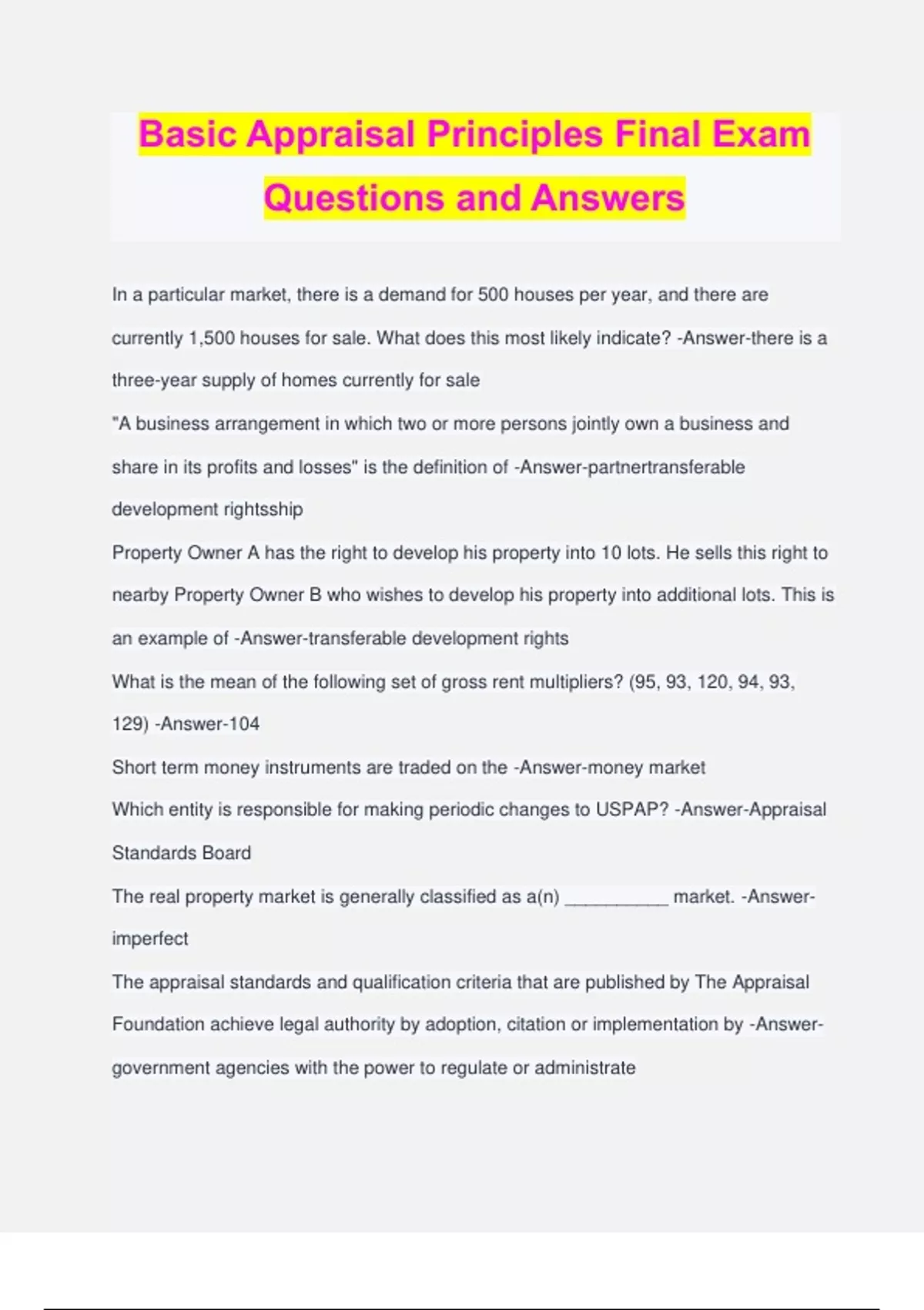 Basic Appraisal Principles Final Exam Questions and Answers In a particular market, there is a demand for 500 houses per year, and there are currently 1,500 houses for sale. What does this most likely indicate? -Answer-there is a three-year supply of homes currently for sale "A business arrangement in which two or more persons jointly own a business and share in its profits and losses" is the definition of -Answer-partnertransferable development rightsship Property Owner A has the right to develop his property into 10 lots. He sells this right to nearby Property Owner B who wishes to develop his property into additional lots. This is an example of -Answer-transferable development rights What is the mean of the following set of gross rent multipliers? (95, 93, 120, 94, 93, 129) -Answer-104 Short term money instruments are traded on the -Answer-money market Which entity is responsible for making periodic changes to USPAP? -Answer-Appraisal Standards Board The real property market is generally classified as a(n) __________ market. -Answer- imperfect The appraisal standards and qualification criteria that are published by The Appraisal Foundation achieve legal authority by adoption, citation or implementation by -Answer- government agencies with the power to regulate or administrate Eric pays $35,000 to have an inground swimming pool constructed in his back yard. When he sells the property, he only receives $10,000 more for his property than what similar property sold for without a pool. This is an example of the principle of -Answer- contribution "The ownership interest held by the lessor, which includes the right to receive the contract rent specified in the lease plus the reversionary right when the lease expires" is the definition of -Answer-leased fee interest When appraising an income producing property, you have the following GRMs indicated from comparable sales (122, 159, 132, 126, 122, 173, 152, 126). What is the mode of the GRMs? -Answer-122, 126 (bi-modal) The current number of appraisal education hours required for Certified General Appraiser applicants is ______ hours. -Answer-300 The ________ is responsible for establishing criteria for individuals to become real property appraisers. -Answer-Appraiser Qualifications Board The federal financial institutions regulatory agencies directly involved in fair lending include all of the following EXCEPT -Answer-ASB A homeowner fears the construction of a factory nearby will decrease the value of her property. This illustrates the principle of -Answer-externalities Under the current qualification criteria, an applicant for Appraiser Trainee must have completed ___ creditable hours of experience. -Answer-0 What is the mode of the following set of gross rent multipliers? (95, 93, 120, 94, 93, 129) -Answer-93