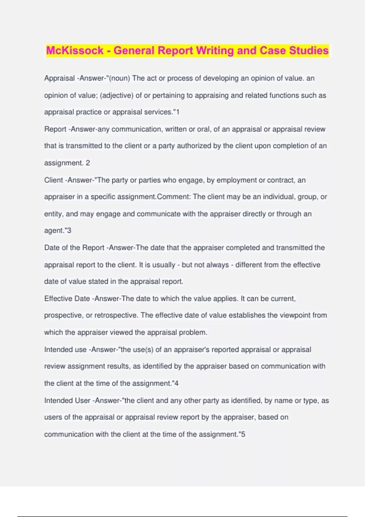 McKissock - General Report Writing and Case Studies Appraisal -Answer-"(noun) The act or process of developing an opinion of value. an opinion of value; (adjective) of or pertaining to appraising and related functions such as appraisal practice or appraisal services."1 Report -Answer-any communication, written or oral, of an appraisal or appraisal review that is transmitted to the client or a party authorized by the client upon completion of an assignment. 2 Client -Answer-"The party or parties who engage, by employment or contract, an appraiser in a specific assignment.Comment: The client may be an individual, group, or entity, and may engage and communicate with the appraiser directly or through an agent."3 Date of the Report -Answer-The date that the appraiser completed and transmitted the appraisal report to the client. It is usually - but not always - different from the effective date of value stated in the appraisal report. Effective Date -Answer-The date to which the value applies. It can be current, prospective, or retrospective. The effective date of value establishes the viewpoint from which the appraiser viewed the appraisal problem. Intended use -Answer-"the use(s) of an appraiser's reported appraisal or appraisal review assignment results, as identified by the appraiser based on communication with the client at the time of the assignment."4 Intended User -Answer-"the client and any other party as identified, by name or type, as users of the appraisal or appraisal review report by the appraiser, based on communication with the client at the time of the assignment."5 Personal Property -Answer-"Identifiable tangible objects that are considered by the general public as being 'personal' (e.g., furnishings, artwork, antiques, gems and jewelry, collectibles, machinery and equipment; all tangible property that is not classified as real estate."6 Real Estate -Answer-"An identified parcel or tract of land, including improvements, if any."7 Real Property -Answer-"The interests, benefits and rights inherent in the ownership of real estate".8 This often is referred to as the "bundle of rights" associated with owning real estate. These rights include: -Answer-The right to sell the property; The right to lease or rent the property; The right to use the property; The right to give the property away; The right to enter or leave the property; and The right to refuse to do anything with the property. To determine the appropriate scope of work for the individual assignment, the appraiser must: -Answer--Rely on the information gained in the first step of the appraisal process. Proper identification of the problem is essential. -Ensure that he or she has the knowledge, experience, and competency to accomplish this assignment. -Determine the client's expectations for this type of assignment. -Not allow the assignment conditions to limit his or her ability to arrive at a credible opinion of value, given the intended use of the appraisal. -Be able to support the decision for the level of work to be accomplished. -Be prepared to defend the research and analysis he or she decided was not required for this assignment's credible opinion of value. Ethics Rule of USPAP -Answer-"An appraiser must promote and preserve the public trust inherent in appraisal practice by observing the highest standards of professional ethics. An appraiser must comply with USPAP when obligated by law or regulation, or by agreement with the client or intended users. In addition to these requirements, an individual should comply any time that individual represents that he or she is performing the service as an appraiser."1 Among the requirements, USPAP states: -Answer-"In reporting the results of a real property appraisal, an appraiser must communicate each analysis, opinion, and conclusion in a manner that is not misleading. Comment: STANDARD 2 addresses the content and level of information required in a report that communicates the results of a real property appraisal. STANDARD 2 does not dictate the form, format, or style of real property appraisal reports. The form, format, and style of a report are functions of the needs of intended users and appraisers. The substantive content of a report determines its compliance. Each written or oral real property report must include: -Answer--clearly and accurately set forth the appraisal in a manner that will not be misleading; -contain sufficient information to enable the intended users of the appraisal to understand the report properly; and -clearly and accurately disclose all assumptions, extraordinary assumptions, hypothetical conditions, and limiting conditions used in the assignment."2 Standard Rule 2-2 -Answer-(a) The content of an Appraisal Report must be consistent with the intended use of the appraisal and, at a minimum: (i) state the identity of the client, unless the client has specifically requested otherwise; state the identity of any intended users by name or type; (ii) state the intended use of the appraisal; (iii) summarize information sufficient to identify the real estate involved in the appraisal, including the physical, legal, and economic property characteristics relevant to the assignment; (iv) state the real property interest appraised; (v) state the type and definition of value and cite the source of the definition; Standard Rule 2-2 Cont: -Answer-(vi) state the effective date of the appraisal and the date of the report; (vii) summarize the scope of work used to develop the appraisal; (viii) summarize the information analyzed, the appraisal methods and techniques employed, and the reasoning that supports the analyses, opinions, and conclusions; exclusion of the sales comparison approach, (ix) state the use of the real estate existing as of the date of value and the use of the real estate reflected in the appraisal; (x) when an opinion of highest and best use was developed by the appraiser, summarize the support and rationale for that opinion; Standard Rule 2-2 C