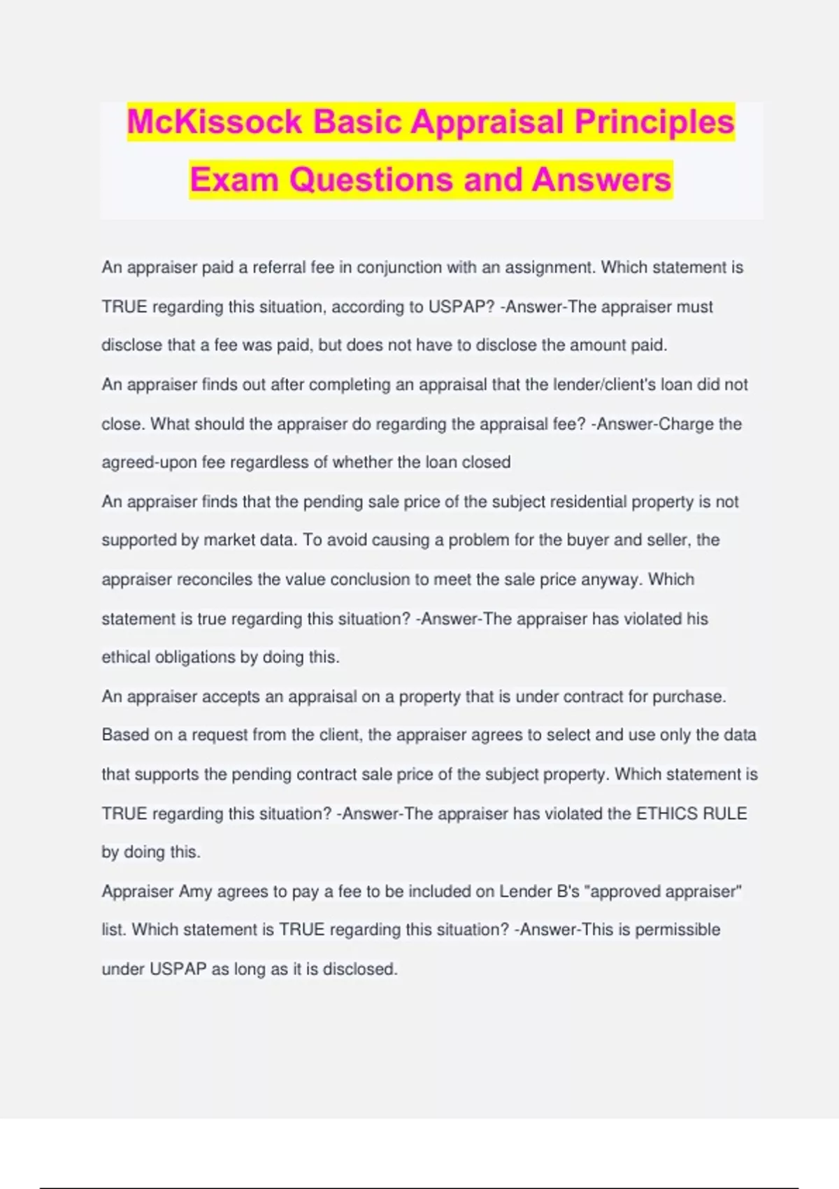 McKissock Basic Appraisal Principles Exam Questions and Answers An appraiser paid a referral fee in conjunction with an assignment. Which statement is TRUE regarding this situation, according to USPAP? -Answer-The appraiser must disclose that a fee was paid, but does not have to disclose the amount paid. An appraiser finds out after completing an appraisal that the lender/client's loan did not close. What should the appraiser do regarding the appraisal fee? -Answer-Charge the agreed-upon fee regardless of whether the loan closed An appraiser finds that the pending sale price of the subject residential property is not supported by market data. To avoid causing a problem for the buyer and seller, the appraiser reconciles the value conclusion to meet the sale price anyway. Which statement is true regarding this situation? -Answer-The appraiser has violated his ethical obligations by doing this. An appraiser accepts an appraisal on a property that is under contract for purchase. Based on a request from the client, the appraiser agrees to select and use only the data that supports the pending contract sale price of the subject property. Which statement is TRUE regarding this situation? -Answer-The appraiser has violated the ETHICS RULE by doing this. Appraiser Amy agrees to pay a fee to be included on Lender B's "approved appraiser" list. Which statement is TRUE regarding this situation? -Answer-This is permissible under USPAP as long as it is disclosed. The fact that the appraiser has previously appraised a property is: -Answer-Not confidential information, and can be disclosed Jack, an appraiser, needs to locate information on zoning ordinances for a property he is appraising. Which resource would most likely have this type of information available on its website? -Answer-Local government website The web site with the largest amount of demographic information is -Answer- EDI stands for -Answer-Electronic Data Interchange Fannie Mae and Freddie Mac created the Uniform Mortgage Data Program (UMDP) for the purpose of -Answer-Standardizing appraisal data Standardizing lending data provided to Fannie Mae and Freddie Mac Protecting sensitive data UAD compliance is required for single-family appraisal reports prepared for -Answer-all of these; VA loan, FHA loan, a conventional loan that is going to be sold to Fannie Mae What would be the correct way to format the date March 15, 2013 in a UAD-compliant appraisal report? -Answer-03/15/2013 Land is a long lasting asset, and has a long economic life as compared to other assets. What characteristic of land does this refer to? -Answer-durability An appraisal is best described as -Answer-an opinion of value "An identified parcel or tract of land, including improvements, if any" is the definition of - Answer-real estate Modern definitions of the word "appraisal" have replaced the word _______ with ________. -Answer-estimate, opinion The public restriction on property rights that allows the government to place a lien on a property is -Answer-taxation Physical land and appurtenances attached to the land is the definition of -Answer-real estate An appraisal is a( n) ____________ of value. -Answer-opinion Which of the following would MOST LIKELY be considered personal property? -Answer- window air conditioner Which is NOT considered to be real estate? -Answer-property rights The process of eminent domain is administered through -Answer-condemnation Which is NOT a public restriction of private property rights? -Answer-easement "The earth's surface, both land and water, and anything that is attached to it whether by the course of nature or human hands" is the definition of -Answer-real estate "The interests, benefits, and rights, inherent in the ownership of real estate" is the definition of -Answer-real property Trade fixtures are most commonly found in ___________ property. -Answer-rented commercial property