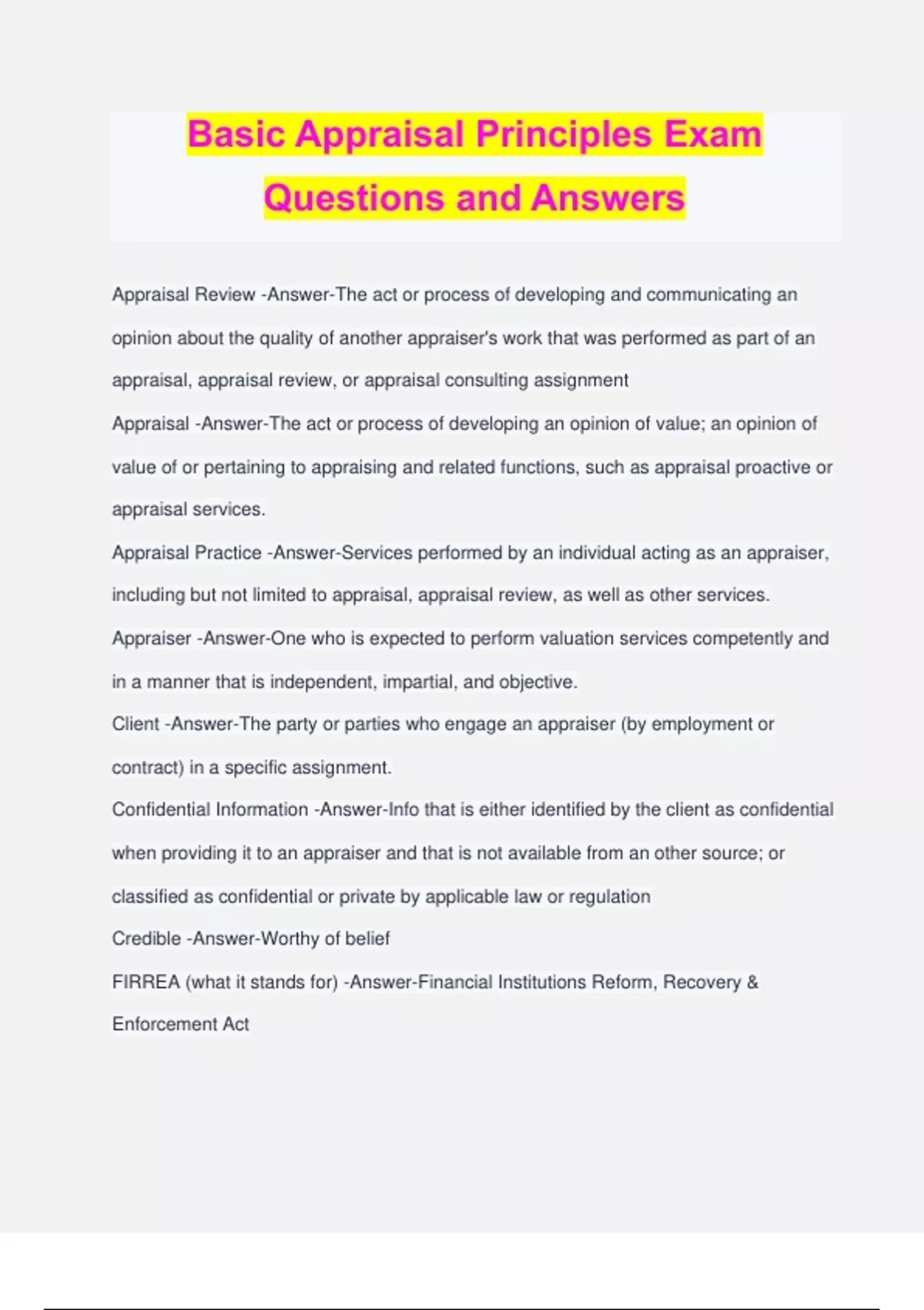 Basic Appraisal Principles Exam Questions and Answers Appraisal Review -Answer-The act or process of developing and communicating an opinion about the quality of another appraiser's work that was performed as part of an appraisal, appraisal review, or appraisal consulting assignment Appraisal -Answer-The act or process of developing an opinion of value; an opinion of value of or pertaining to appraising and related functions, such as appraisal proactive or appraisal services. Appraisal Practice -Answer-Services performed by an individual acting as an appraiser, including but not limited to appraisal, appraisal review, as well as other services. Appraiser -Answer-One who is expected to perform valuation services competently and in a manner that is independent, impartial, and objective. Client -Answer-The party or parties who engage an appraiser (by employment or contract) in a specific assignment. Confidential Information -Answer-Info that is either identified by the client as confidential when providing it to an appraiser and that is not available from an other source; or classified as confidential or private by applicable law or regulation Credible -Answer-Worthy of belief FIRREA (what it stands for) -Answer-Financial Institutions Reform, Recovery & Enforcement Act FIRREA (definition) -Answer-An act passed in 1989 as a comprehensive savings and loan bailout and preventative measure against future S&L insolvency. This Act recognizes USPAP as the industry standard for appraisals, and identifies the Appraisal Foundation as the authority for professional appraisal standards Intended Use -Answer-The use or uses of an appraiser's reported appraisal, appraisal received, or appraisal consulting assignment opinions and conclusions, as identified by the appraiser based on communication with the client at the time of the assignment. Intended User -Answer-The client and any other party as identified, by name or type, as users of the appraisal, appraisal review, or appraisal consulting report by the appraiser on the basis of communication with the client at the time of the assignment