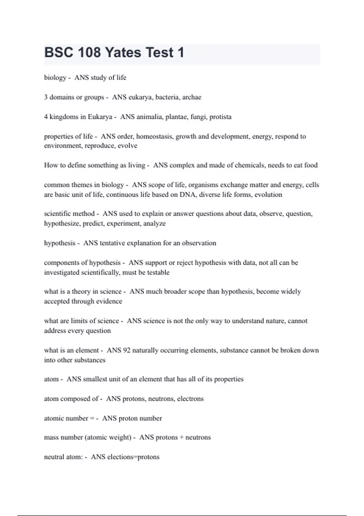 BSC 108 Yates Test 1 QUESTIONS WITH CORRECT ANSWERS | 2024 UPDATED & 100% VERIFIED
