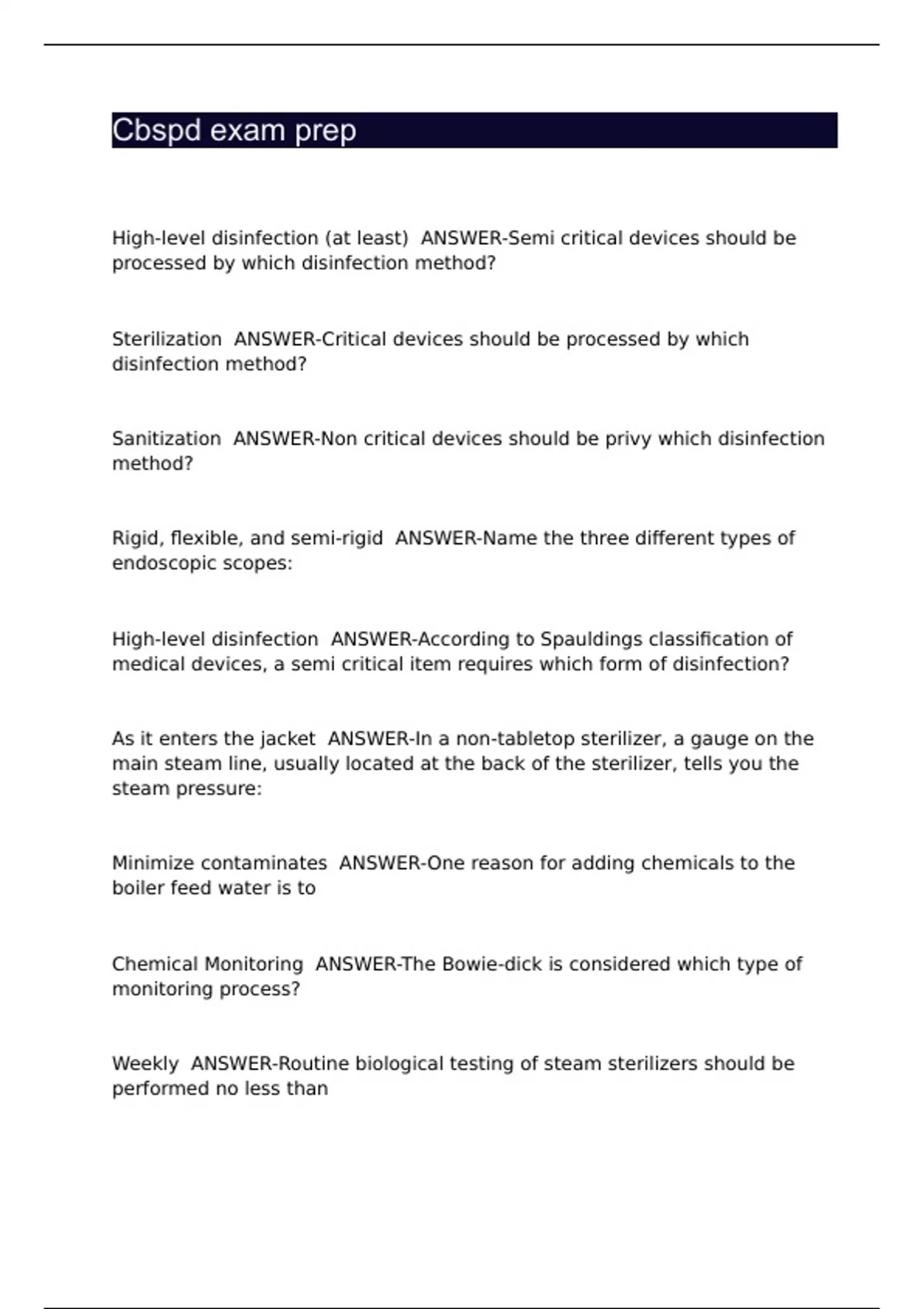 Cbspd exam prep High-level disinfection (at least) ANSWER-Semi critical devices should be processed by which disinfection method? Sterilization ANSWER-Critical devices should be processed by which disinfection method? Sanitization ANSWER-Non critical devices should be privy which disinfection method? Rigid, flexible, and semi-rigid ANSWER-Name the three different types of endoscopic scopes: High-level disinfection ANSWER-According to Spauldings classification of medical devices, a semi critical item requires which form of disinfection? As it enters the jacket ANSWER-In a non-tabletop sterilizer, a gauge on the main steam line, usually located at the back of the sterilizer, tells you the steam pressure: Minimize contaminates ANSWER-One reason for adding chemicals to the boiler feed water is to Chemical Monitoring ANSWER-The Bowie-dick is considered which type of monitoring process? Weekly ANSWER-Routine biological testing of steam sterilizers should be performed no less than Monitored with a biological indicator ANSWER-All loads containing implantable devices should be Geometric center of the load ANSWER-Unless otherwise directed by the sterilizer manufacturer, the ethylene oxide process challenge device (bi test pack) is placed in the: Stainless steel instruments ANSWER-Which of the following is compatible with Hydrogen p