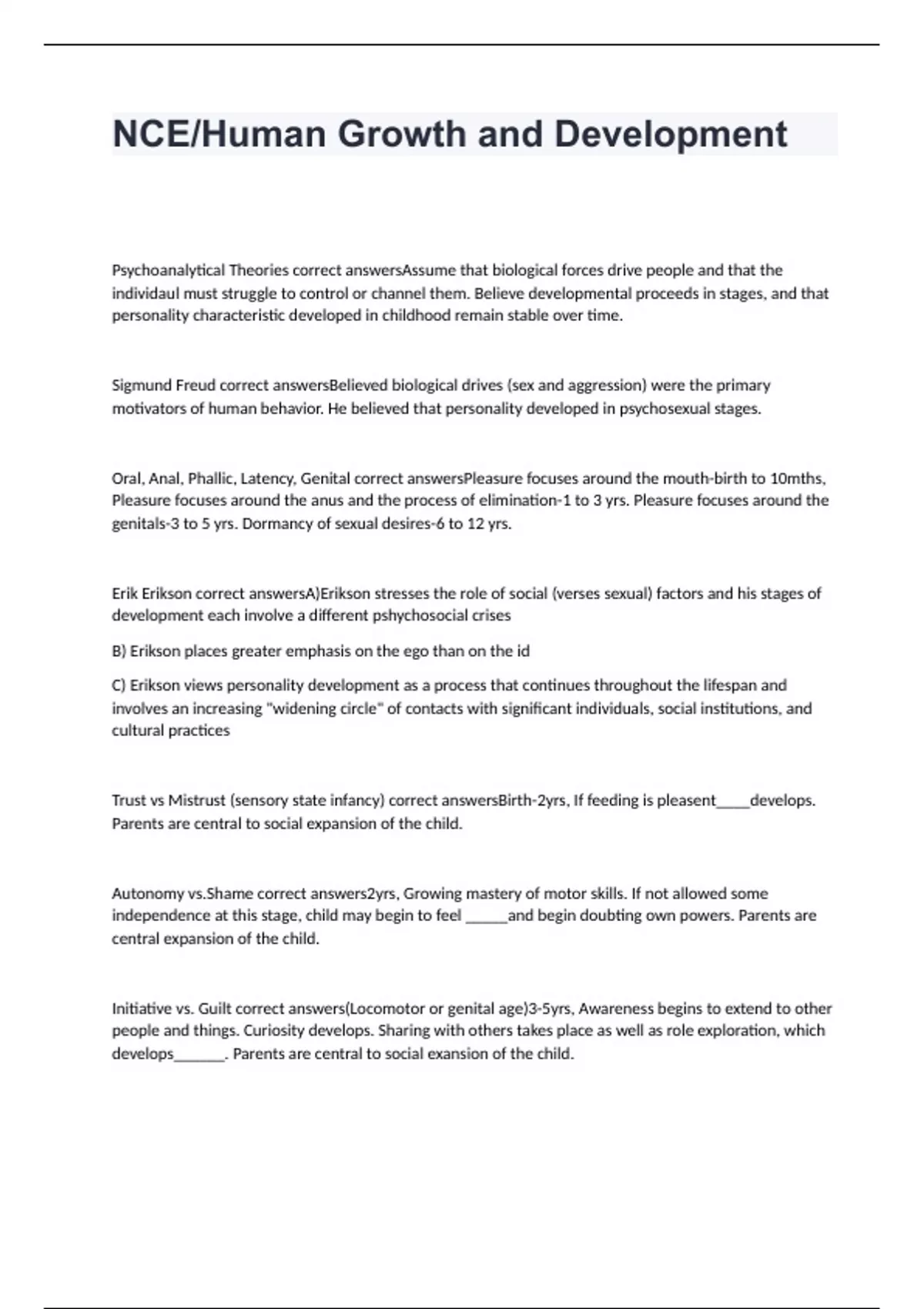 Psychoanalytical Theories correct answersAssume that biological forces drive people and that the individaul must struggle to control or channel them. Believe developmental proceeds in stages, and that personality characteristic developed in childhood remain stable over time. Sigmund Freud correct answersBelieved biological drives (sex and aggression) were the primary motivators of human behavior. He believed that personality developed in psychosexual stages. Oral, Anal, Phallic, Latency, Genital correct answersPleasure focuses around the mouth-birth to 10mths, Pleasure focuses around the anus and the process of elimination-1 to 3 yrs. Pleasure focuses around the genitals-3 to 5 yrs. Dormancy of sexual desires-6 to 12 yrs. Erik Erikson correct answersA)Erikson stresses the role of social (verses sexual) factors and his stages of development each involve a different pshychosocial crises B) Erikson places greater emphasis on the ego than on the id C) Erikson views personality development as a process that continues throughout the lifespan and involves an increasing "widening circle" of contacts with significant individuals, social institutions, and cultural practices Trust vs Mistrust (sensory state infancy) correct answersBirth-2yrs, If feeding is pleasent____develops. Parents are central to social expansion of the child. Autonomy vs.Shame correct answers2yrs, Growing mastery of motor skills. If not allowed some independence at this stage, child may begin to feel _____and begin doubting own powers. Parents are central expansion of the child. Initiative vs. Guilt correct answers(Locomotor or genital age)3-5yrs, Awareness begins to extend to other people and things. Curiosity develops. Sharing with others takes place as well as role exploration, which develops______. Parents are central to social exansion of the child.