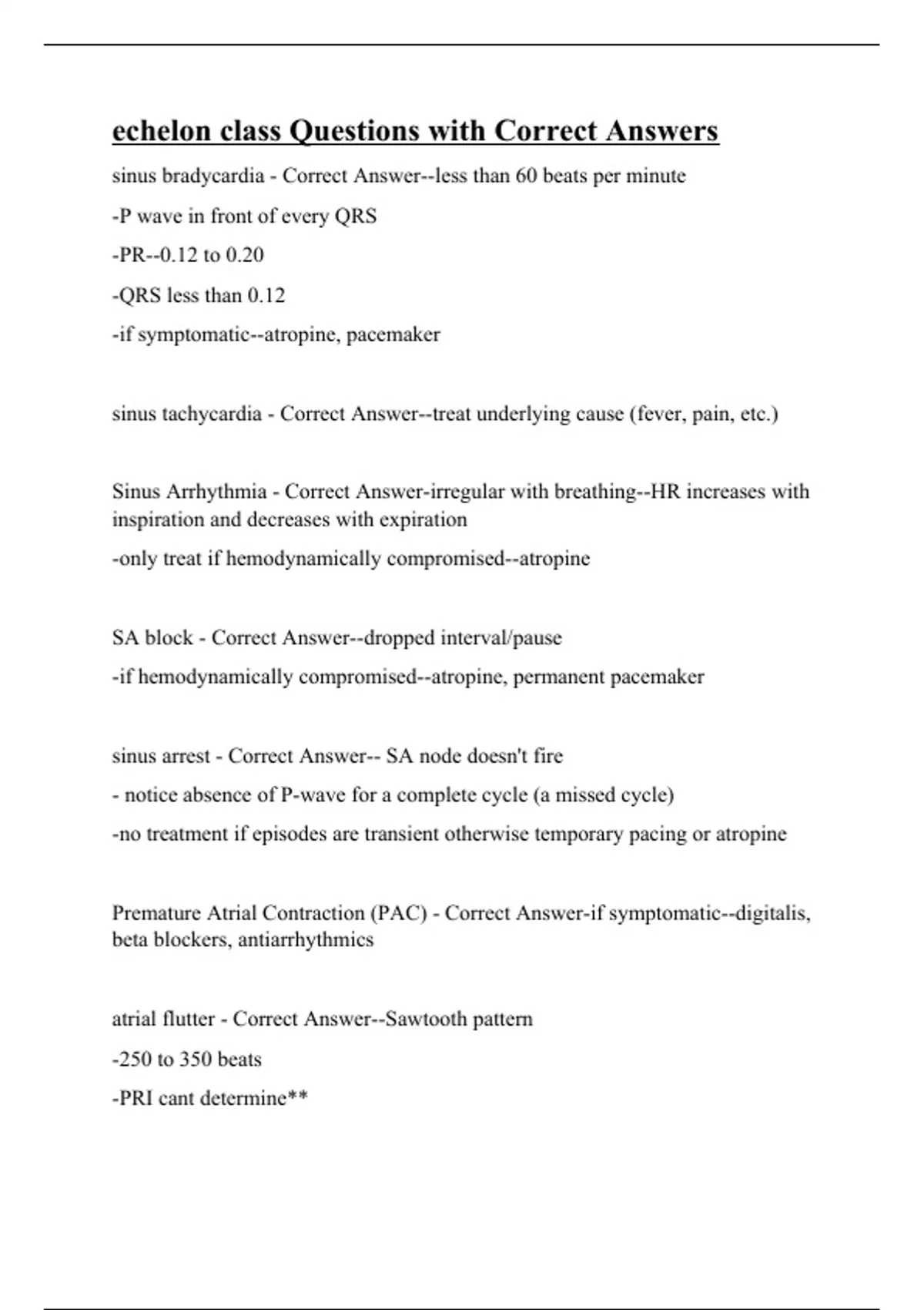 sinus bradycardia - Correct Answer--less than 60 beats per minute -P wave in front of every QRS -PR--0.12 to 0.20 -QRS less than 0.12 -if symptomatic--atropine, pacemaker sinus tachycardia - Correct Answer--treat underlying cause (fever, pain, etc.) Sinus Arrhythmia - Correct Answer-irregular with breathing--HR increases with inspiration and decreases with expiration -only treat if hemodynamically compromised--atropine SA block - Correct Answer--dropped interval/pause -if hemodynamically compromised--atropine, permanent pacemaker sinus arrest - Correct Answer-- SA node doesn't fire - notice absence of P-wave for a complete cycle (a missed cycle) -no treatment if episodes are transient otherwise temporary pacing or atropine Premature Atrial Contraction (PAC) - Correct Answer-if symptomatic--digitalis, beta blockers, antiarrhythmics atrial flutter - Correct Answer--Sawtooth pattern -250 to 350 beats