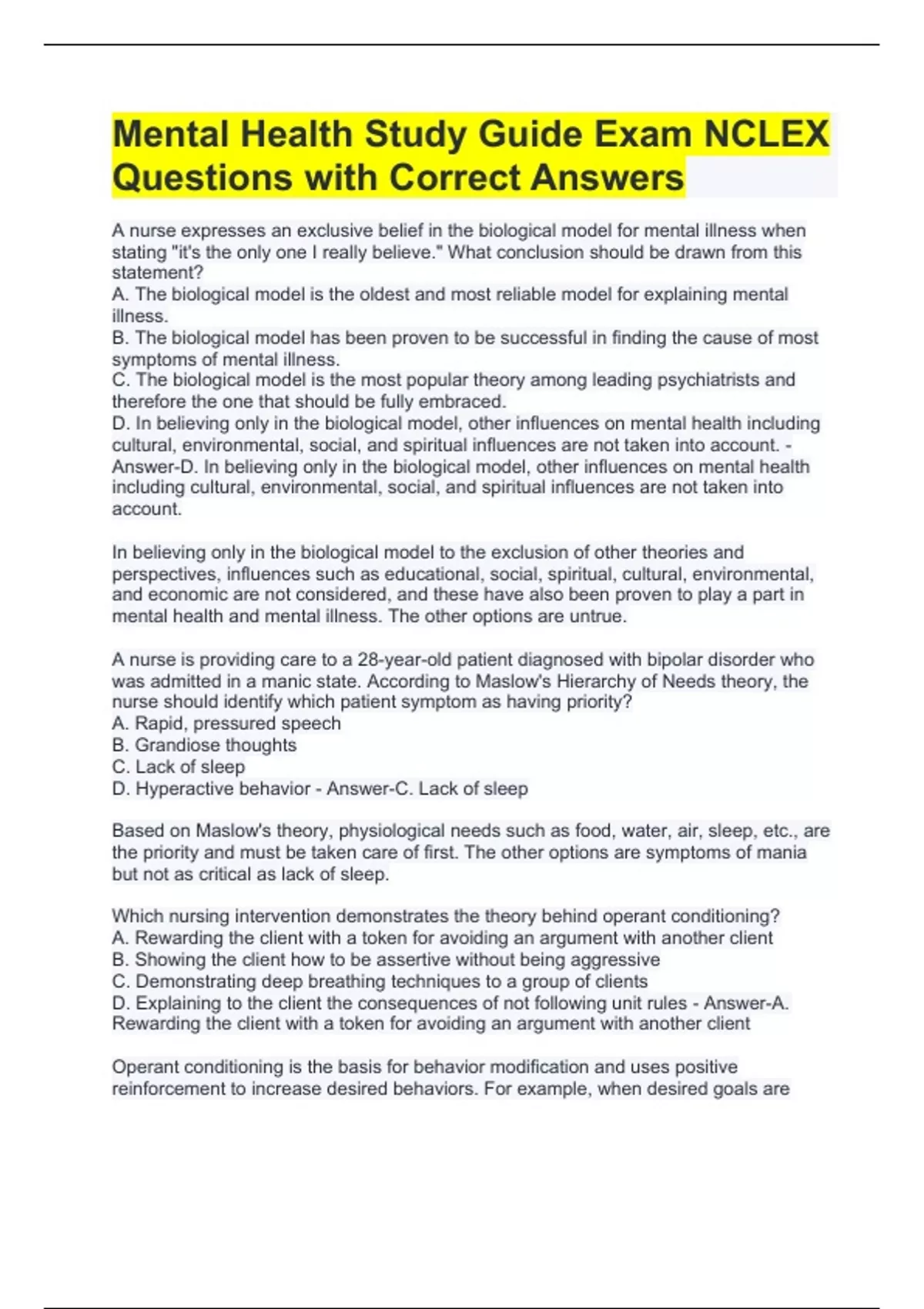Mental Health Study Guide Exam NCLEX Questions with Correct Answers