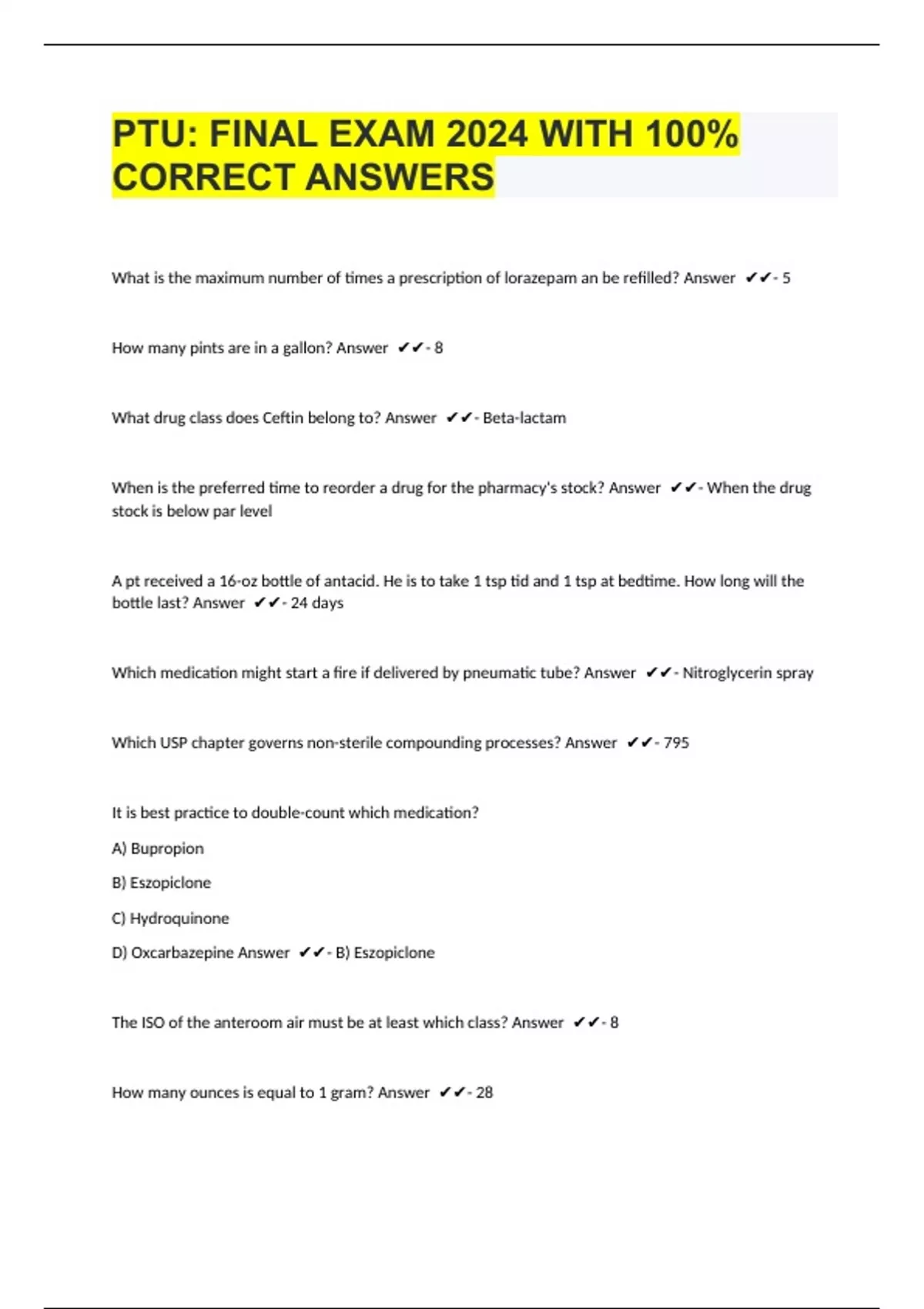 What is the maximum number of times a prescription of lorazepam an be refilled? Answer - 5 How many pints are in a gallon? Answer - 8 What drug class does Ceftin belong to? Answer - Beta-lactam When is the preferred time to reorder a drug for the pharmacy's stock? Answer - When the drug stock is below par level A pt received a 16-oz bottle of antacid. He is to take 1 tsp tid and 1 tsp at bedtime. How long will the bottle last? Answer - 24 days Which medication might start a fire if delivered by pneumatic tube? Answer - Nitroglycerin spray Which USP chapter governs non-sterile compounding processes? Answer - 795 It is best practice to double-count which medication? A) Bupropion B) Eszopiclone C) Hydroquinone D) Oxcarbazepine Answer - B) Eszopiclone The ISO of the anteroom air must be at least which class? Answer - 8 How many ounces is equal to 1 gram? Answer - 28 Which service does OBRA '90 require pharmacies to offer Medicaid patients? Answer - Counseling What is a requirement of the iPledge program for isotrentinoin? Answer - The pharmacist must document the RMA number on the isotrentinoin prescription What is the sensitivi