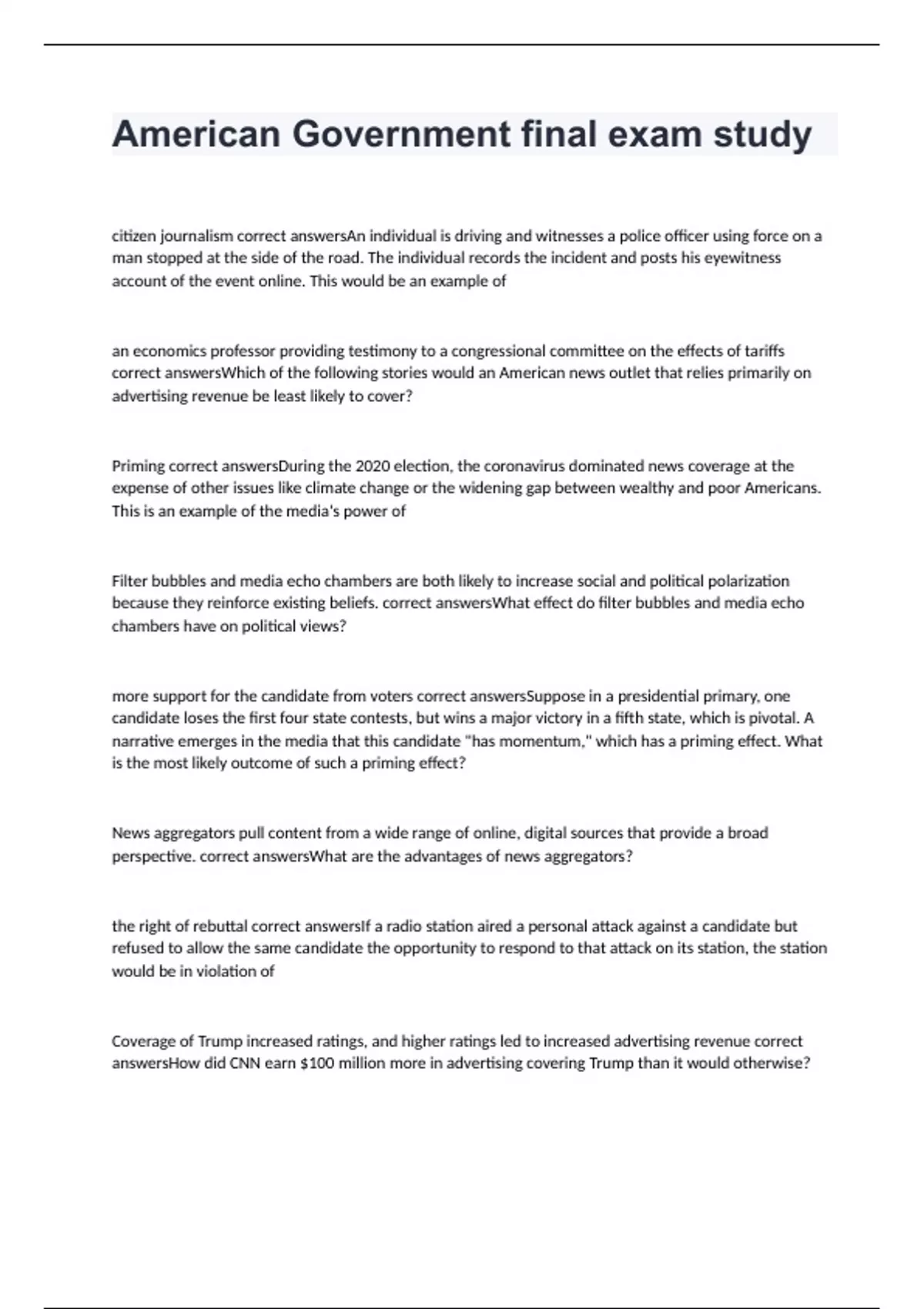 citizen journalism correct answersAn individual is driving and witnesses a police officer using force on a man stopped at the side of the road. The individual records the incident and posts his eyewitness account of the event online. This would be an example of an economics professor providing testimony to a congressional committee on the effects of tariffs correct answersWhich of the following stories would an American news outlet that relies primarily on advertising revenue be least likely to cover? Priming correct answersDuring the 2020 election, the coronavirus dominated news coverage at the expense of other issues like climate change or the widening gap between wealthy and poor Americans. This is an example of the media's power of Filter bubbles and media echo chambers are both likely to increase social and political polarization because they reinforce existing beliefs. correct answersWhat effect do filter bubbles and media echo chambers have on political views? more support for the candidate from voters correct answersSuppose in a presidential primary, one candidate loses the first four state contests, but wins a major victory in a fifth state, which is pivotal. A narrative emerges in the media that this candidate "has momentum," which has a priming effect. What is the most likely outcome of such a priming effect? News aggregators pull content from a wide range of online, digital sources that provide a broad perspective. correct answersWhat are the advantages of news aggregators? the right of rebuttal correct answersIf a radio station aired a personal attack against a candidate but refused to allow the same candidate the opportunity to respond to that attack on its station, the station would be in violation of