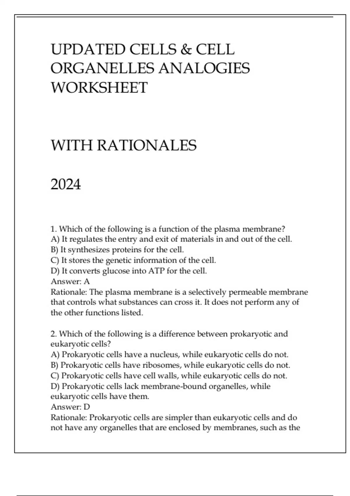 UPDATED CELLS & CELL ORGANELLES ANALOGIES WORKSHEET WITH RATIONALES 2024