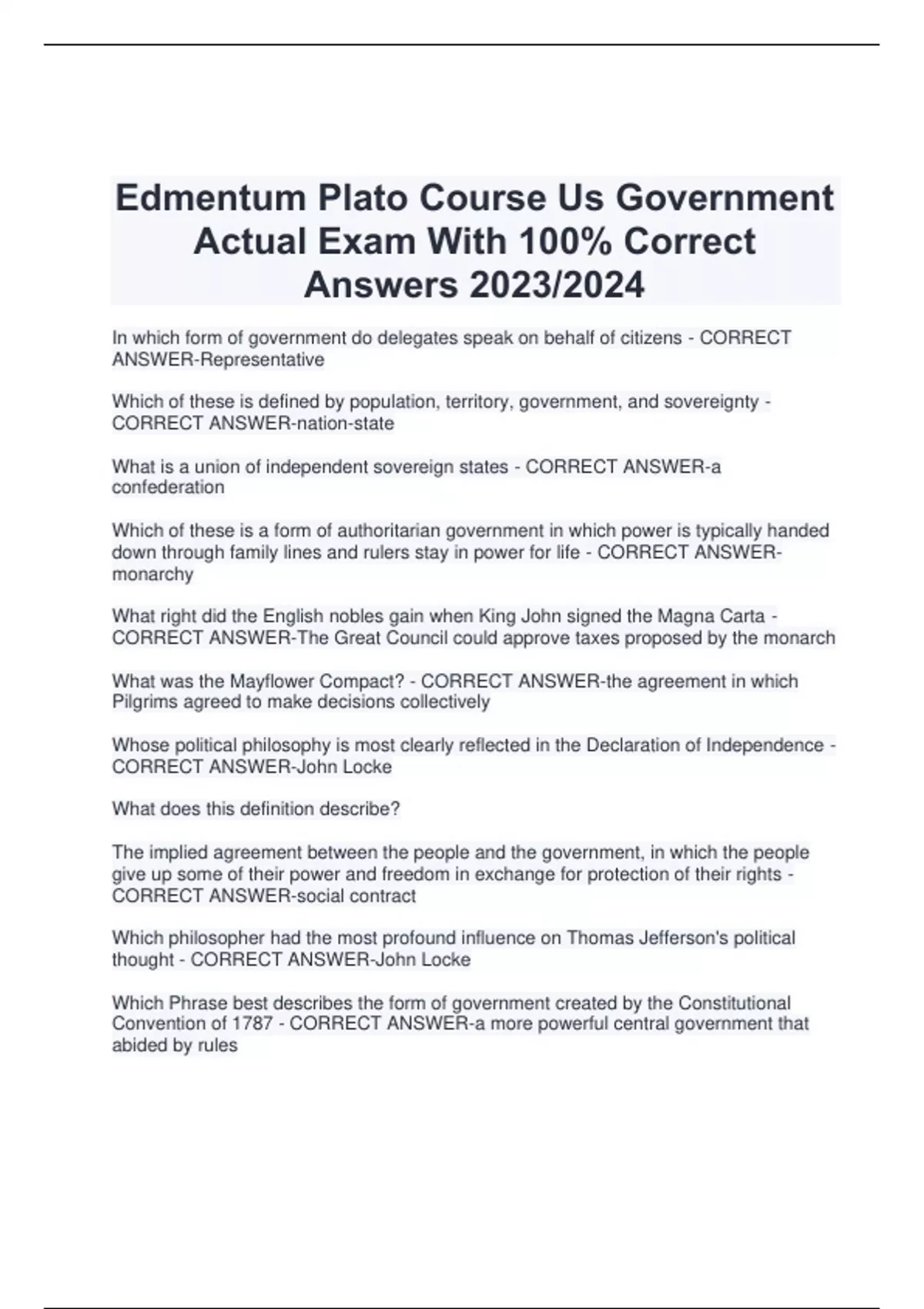 Edmentum Plato Course Us Government Actual Exam With 100% Correct Answers 2023/2024 In which form of government do delegates speak on behalf of citizens - CORRECT ANSWER-Representative Which of these is defined by population, territory, government, and sovereignty - CORRECT ANSWER-nation-state What is a union of independent sovereign states - CORRECT ANSWER-a confederation Which of these is a form of authoritarian government in which power is typically handed down through family lines and rulers stay in power for life - CORRECT ANSWERmonarchy What right did the English nobles gain when King John signed the Magna Carta - CORRECT ANSWER-The Great Council could approve taxes proposed by the monarch