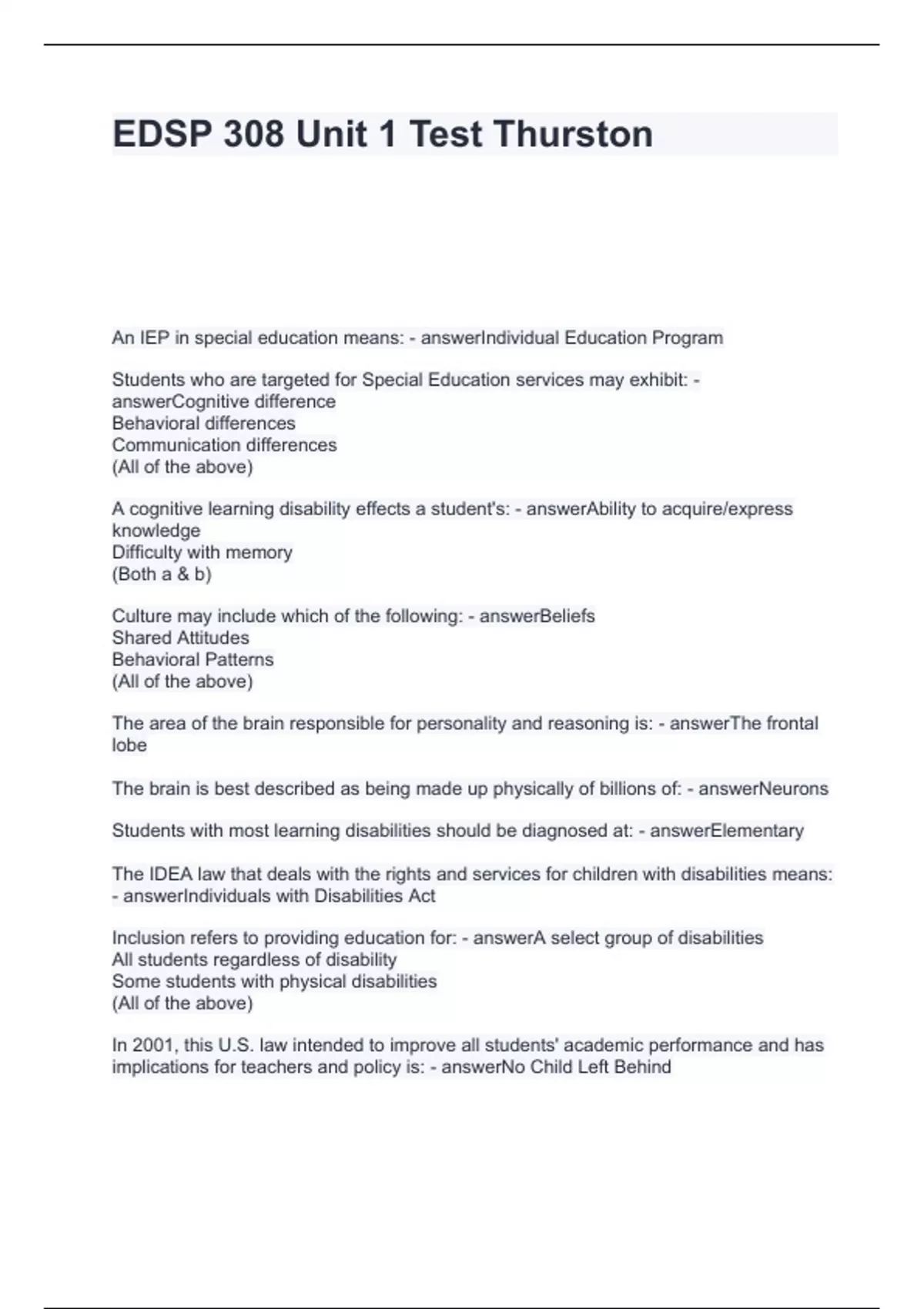 EDSP 308 Unit 1 Test Thurston Questions with correct Answers 2024