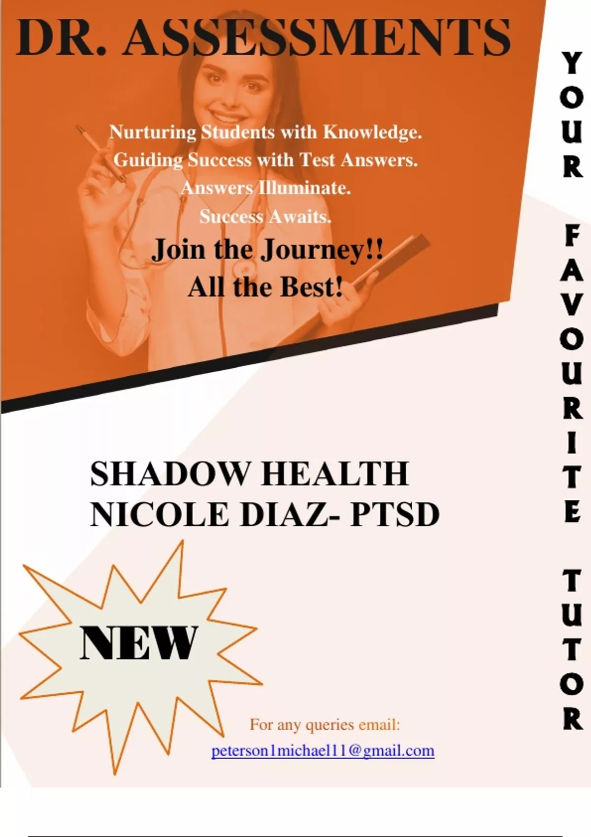 SHADOW HEALTH NICOLE DIAZ- PTSD Questions and Answers with Explanations (latest Update), 100% Correct, Download to Score A