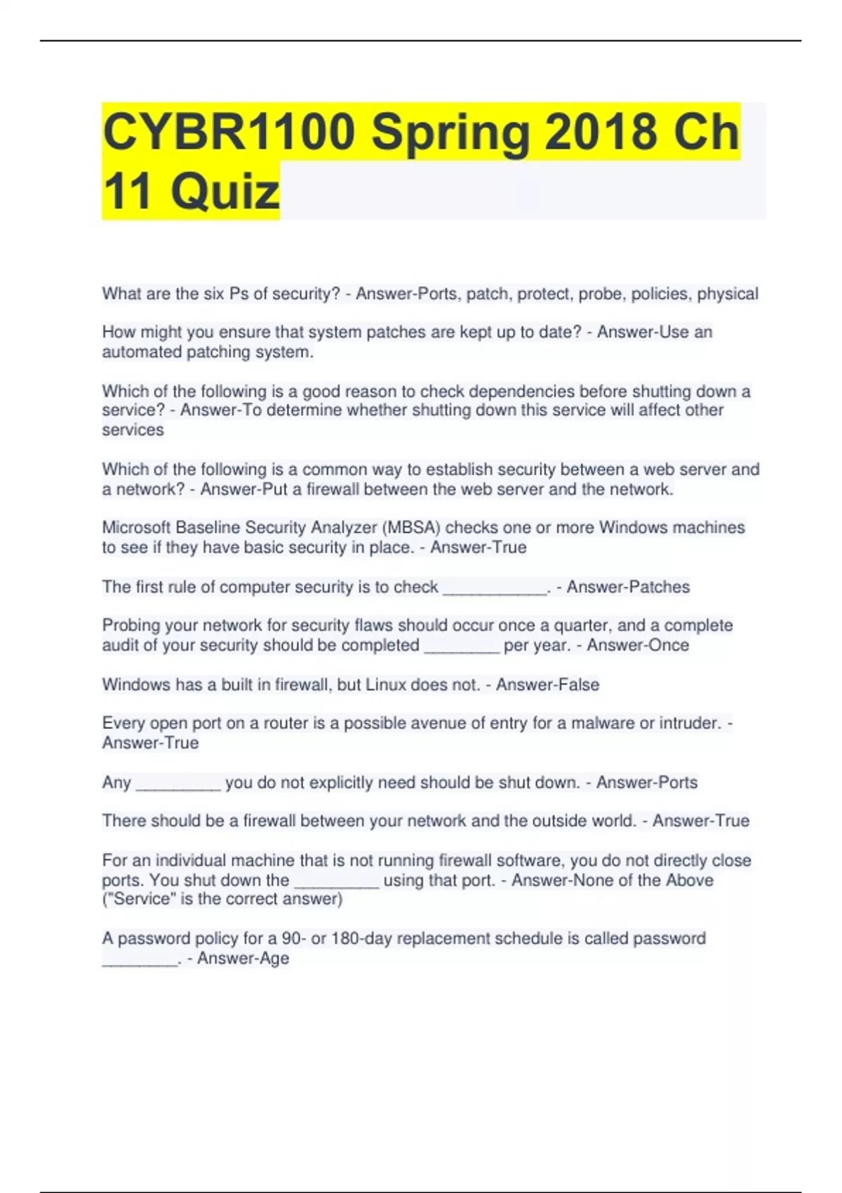 CYBR1100 Spring 2018 Ch 11 Quiz What are the six Ps of security? - Answer-Ports, patch, protect, probe, policies, physical How might you ensure that system patches are kept up to date? - Answer-Use an automated patching system. Which of the following is a good reason to check dependencies before shutting down a service? - Answer-To determine whether shutting down this service will affect other services Which of the following is a common way to establish security between a web server and a network? - Answer-Put a firewall between the web server and the network. Microsoft Baseline Security Analyzer (MBSA) checks one or more Windows machines to see if they have basic security in place. - Answer-True The first rule of computer security is to check ___________. - Answer-Patches Probing your network for security flaws should occur once a quarter, and a complete audit of your security should be completed ________ per year. - Answer-Once Windows has a built in firewall, but Linux does not. - Answer-False Every open port on a router is a possible avenue of entry for a malware or intruder. - Answer-True Any _________ you do not explicitly need should be shut down. - Answer-Ports