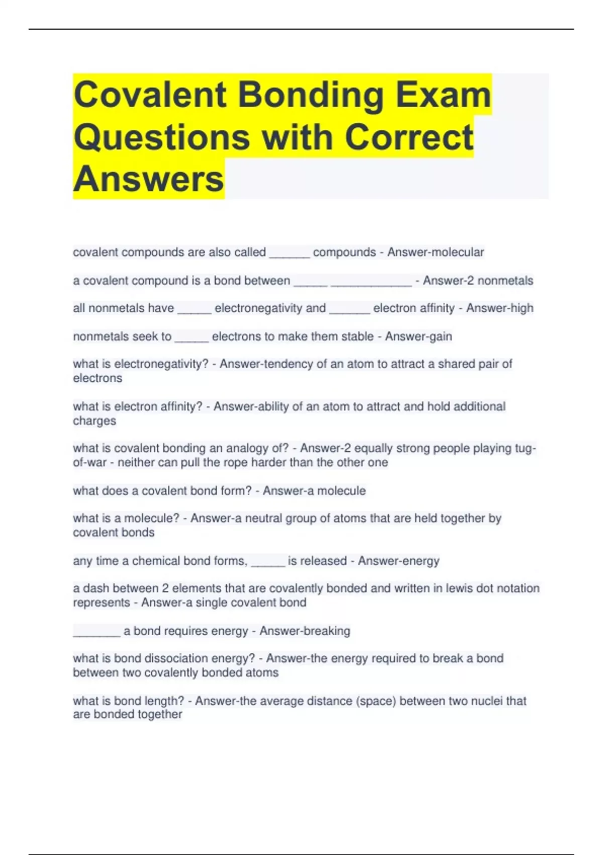 Covalent Bonding Exam Questions with Correct Answers covalent compounds are also called ______ compounds - Answer-molecular a covalent compound is a bond between _____ ____________ - Answer-2 nonmetals all nonmetals have _____ electronegativity and ______ electron affinity - Answer-high nonmetals seek to _____ electrons to make them stable - Answer-gain what is electronegativity? - Answer-tendency of an atom to attract a shared pair of electrons what is electron affinity? - Answer-ability of an atom to attract and hold additional charges what is covalent bonding an analogy of? - Answer-2 equally strong people playing tugof-war - neither can pull the rope harder than the other one what does a covalent bond form? - Answer-a molecule what is a molecule? - Answer-a neutral group of atoms that are held together by covalent bonds any time a chemical bond forms, _____ is released - Answer-energy a dash between 2 elements that are covalently bonded and written in lewis dot notation represents - Answer-a single covalent bond _______ a bond requires energy - Answer-breaking what is bond dissociation energy? - Answer-the energy required to break a bond between two covalently bonded atoms what is bond length? - Answer-the average distance (space) between two nuclei that are bonded together when bond lengths are ______, atoms are very close, and ____ energy is required to separate them - Answer-short; more large atoms have more energy levels of electrons, so there are _____ bond lengths, therefore _____ energy is required to separate atoms - Answer-longer; less what are the 7 diatomic molecules? - Answer-H2, N2, O2, F2, Cl2, B2, I2 how many valence electrons do metals have? - Answer-1-3 how many valence electrons do nonmetals have? - Answer-5-7 in a covalent bond, shared electrons fill the _____ orbitals of both atoms, making them both stable - Answer-outer what is an exothermic reaction? - Answer-energy is released as atoms move from a high energy state to a low energy state when covalent bonds form covalent bonds form because _______________________ - Answer-electrons of one atom are attracted to the positive nucleus of another atom