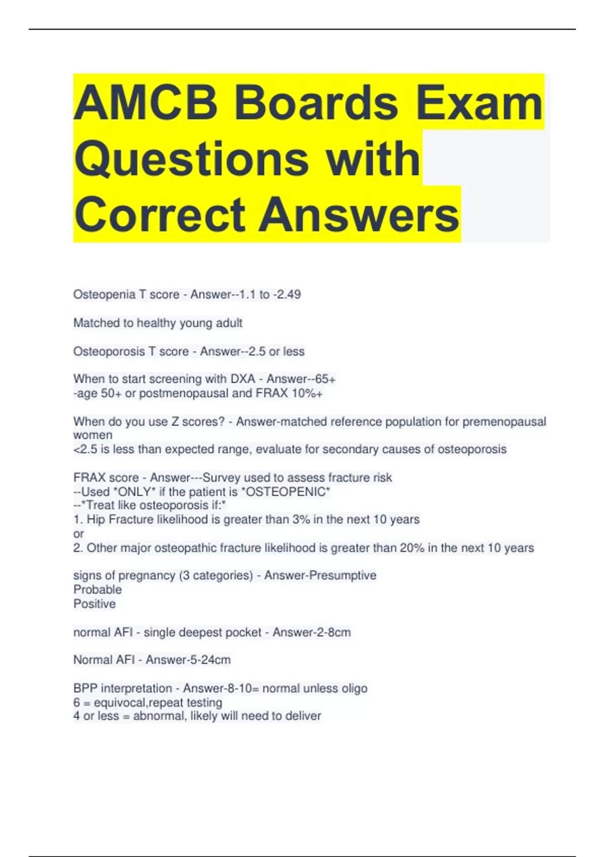 AMCB Boards Exam Questions with Correct Answers Osteopenia T score - Answer--1.1 to -2.49 Matched to healthy young adult Osteoporosis T score - Answer--2.5 or less When to start screening with DXA - Answer--65+ -age 50+ or postmenopausal and FRAX 10%+ When do you use Z scores? - Answer-matched reference population for premenopausal women 2.5 is less than expected range, evaluate for secondary causes of osteoporosis FRAX score - Answer---Survey used to assess fracture risk --Used *ONLY* if the patient is *OSTEOPENIC* --*Treat like osteoporosis if:* 1. Hip Fracture likelihood is greater than 3% in the next 10 years or 2. Other major osteopathic fracture likelihood is greater than 20% in the next 10 years signs of pregnancy (3 categories) - Answer-Presumptive Probable Positive normal AFI - single deepest pocket - Answer-2-8cm Normal AFI - Answer-5-24cm BPP interpretation - Answer-8-10= normal unless oligo 6 = equivocal,repeat testing 4 or less = abnormal, likely will need to deliver weight gain by bmi - Answer-underweight (18.5): 28-40lbs Normalweight: 18.5-24.9 25-35lbs overweight: 25.0-29.9 15-25lbs obese: 30+ 11-20lbs gynecoid pelvis - Answer-round-shaped transverse slightly wider than AP 50% of white women android - Answer-heart shaped/triangular shaped posterior pelvis is wider than anterior pelvis more likely to need c/s anthropoid pelvis - Answer-oval shaped, with a wider anteroposterior diameter more likely to be OP platypelloid pelvis - Answer-pelvis that is flat in its dimensions with a very narrow anterior-posterior diameter and a wide transverse diameter; this shape makes it extremely difficult for the fetus to pass through the bony pelvis Hct - Answer-normal non pregnant: 37-42% pregnancy:33/32/33 black women: 31/30/31 Hbg - Answer-normal non pregnancy: 12-16 pregnancy: 11/10.5/11 black women: 10.2/9.7/10.2 wbc - Answer- platelets - Answer-150,000-400,000 Fasting glucose - Answer-Normal: 70-99 mg/dL pre-diabetes: 100-125 mg/dL diabetes: 125 mg/dL 2hr glucose tolerance test - Answer-normal:140 prediabetes:140-199 diabetes:200+ ADA diagnostic criteria for DM - Answer-1. any random glucose of 200+ 2. fasting 126+ 3. 2hr: 200+ 4. HgbA1c 6.5%+ Hgb A1c - Answer-prediabetes: 5.7-6.4 diabetes 6.5+ good diabetic control:7 Diagnosis of gestational diabetes - Answer-Fasting: 95-105+ (CC v. NDDG) 1 hr: 180-190+ 2 hr: 155-165+ 3 hr: 140-145+ or any BG level 200+ changes in thyroid hormones in pregnancy - Answer-TT3 and TT4 increase TSH unchanged free T4 unchanged normal vaginal pH - Answer-3.8-4.5 What may cause elevated vaginal pH - Answer-BV,trich, atrophic vaginitis,breastfeeding normal urine findings - Answer-no nitrites, ketones,crystals, casts, glucose clear, amber yellow, aromatic pH4.6-8 protein 0-8 specific gravity 1.005-1.030 leukocyte esterase negative WBCs 0-4 per high powered field RBCs 2 or less B6 and unisom - Answer-b6: 50mg BID or 25mg TID-QID doxylamine: 12.5 to 25mg PO q8-12hrs what measurements are used for dating 2nd trimester ultrasound - Answer-head circumference, biparietal diameter, abdominal circumference and femur length Naegele's Rule - Answer-add 7 days to LMP, subtract 3 months, add 1 year Beta hcg in pregnancy - Answer-detectable 8-11 days after conception doubles every 2 days until it peaks at 8.5- 10 weeks gestation then rapidly declines between 12 and 16 weeks gestation. first trimester GDM screening - Answer-BMI 25 (23 if asian) + additional risk factors like Hx GDM, 1st degree relative with DM, hx infant 4000g,PCOS,HTN, not white Hep B in pregnancy - Answer-rate of fetal transmission during birth: 90%.