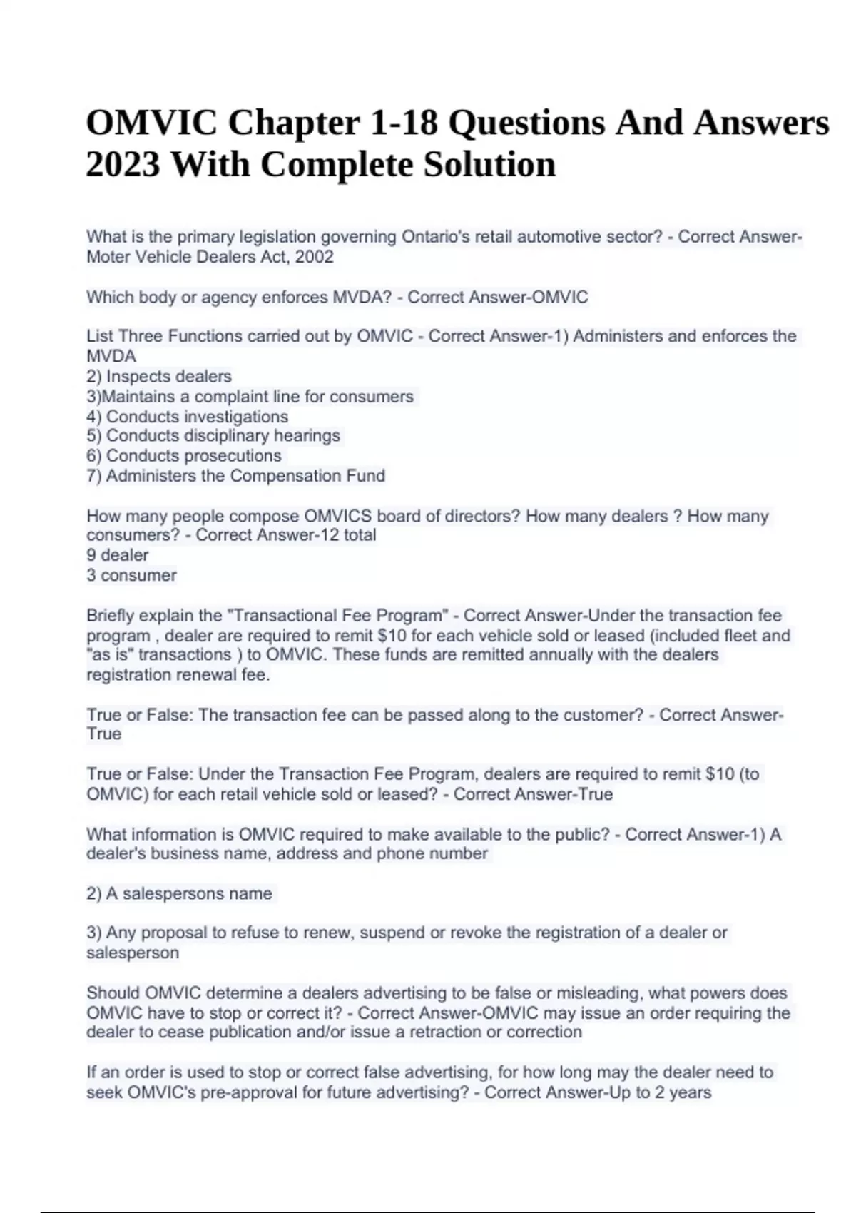 OMVIC Chapter 1-18 Questions And Answers 2023 With Complete Solution. What is the primary legislation governing Ontario's retail automotive sector? - Correct AnswerMoter Vehicle Dealers Act, 2002 Which body or agency enforces MVDA? - Correct Answer-OMVIC List Three Functions carried out by OMVIC - Correct Answer-1) Administers and enforces the MVDA 2) Inspects dealers 3)Maintains a complaint line for consumers 4) Conducts investigations 5) Conducts disciplinary hearings 6) Conducts prosecutions 7) Administers the Compensation Fund How many people compose OMVICS board of directors? How many dealers ? How many consumers? - Correct Answer-12 total 9 dealer 3 consumer Briefly explain the "Transactional Fee Program" - Correct Answer-Under the transaction fee program , dealer are required to remit $10 for each vehicle sold or leased (included fleet and "as is" transactions ) to OMVIC. These funds are remitted annually with the dealers registration renewal fee. True or False: The transaction fee can be passed along to the customer? - Correct AnswerTrue True or False: Under the Transaction Fee Program, dealers are required to remit $10 (to OMVIC) for each retail vehicle sold or leased? - Correct Answer-True What information is OMVIC required to make available to the public? - Correct Answer-1) A dealer's business name, address and phone number 2) A salespersons name 3) Any proposal to refuse to renew, suspend or revoke the registration of a dealer or salesperson Should OMVIC determine a dealers advertising to be false or misleading, what powers does OMVIC have to stop or correct it? - Correct Answer-OMVIC may issue an order requiring the dealer to cease publication and/or issue a retraction or correction .