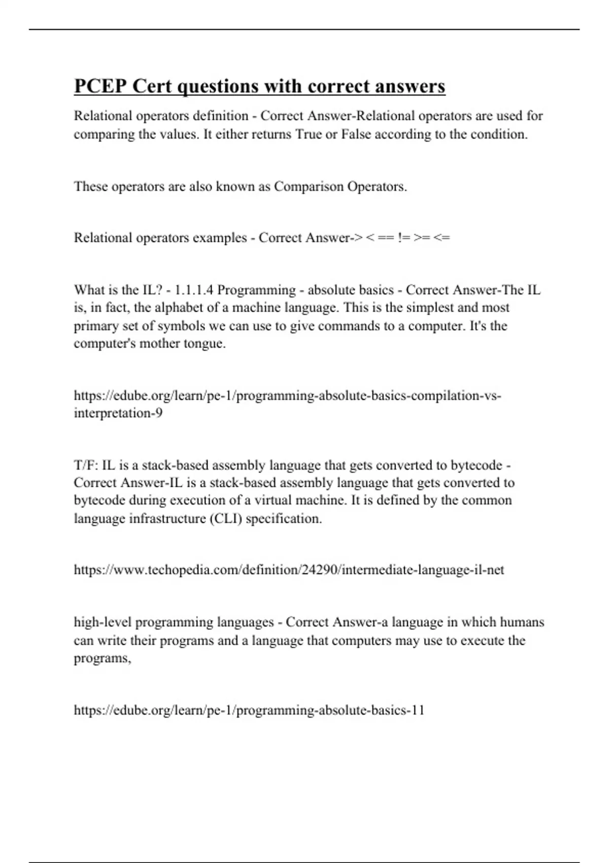 Relational operators definition - Correct Answer-Relational operators are used for comparing the values. It either returns True or False according to the condition. These operators are also known as Comparison Operators. Relational operators examples - Correct Answer- == != = = What is the IL? - 1.1.1.4 Programming - absolute basics - Correct Answer-The IL is, in fact, the alphabet of a machine language. This is the simplest and most primary set of symbols we can use to give commands to a computer. It's the computer's mother tongue. T/F: IL is a stack-based assembly language that gets converted to bytecode - Correct Answer-IL is a stack-based assembly language that gets converted to bytecode during execution of a virtual machine. It is defined by the common language infrastructure (CLI) specification. high-level programming languages - Correct Answer-a language in which humans can write their programs and a language that computers may use to execute the programs,