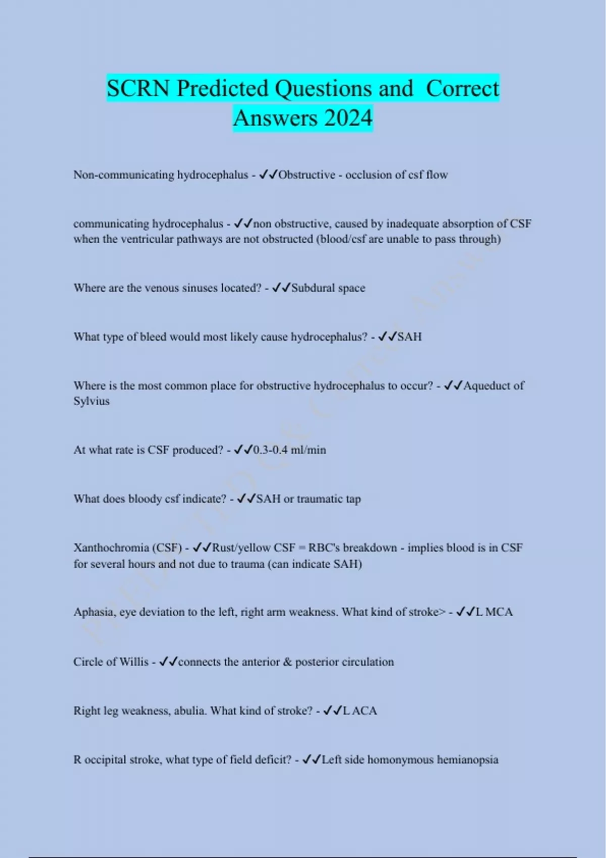 Non-communicating hydrocephalus - Obstructive - occlusion of csf flow communicating hydrocephalus - non obstructive, caused by inadequate absorption of CSF when the ventricular pathways are not obstructed (blood/csf are unable to pass through) Where are the venous sinuses located? - Subdural space What type of bleed would most likely cause hydrocephalus? - SAH Where is the most common place for obstructive hydrocephalus to occur? - Aqueduct of Sylvius At what rate is CSF produced? - 0.3-0.4 ml/min What does bloody csf indicate? - SAH or traumatic tap Xanthochromia (CSF) - Rust/yellow CSF = RBC's breakdown - implies blood is in CSF for several hours and not due to trauma (can indicate SAH) Aphasia, eye deviation to the left, right arm weakness. What kind of stroke - L MCA Circle of Willis - connects the anterior & posterior circulation Right leg weakness, abulia. What kind of stroke? - L ACA R occipital stroke, what type of field deficit? - Left side homonymous hemianopsia Where does the ACA supply blood flow to? - Frontal and parietal lobes Where does the MCA supply blood to? - Frontal, parietal, and temporal lobes Where does the PCA supply blood to? - Occipital lobe, midbrain Weber's syndrome - third nerve palsy (droopy eye) - seen with PCA strokes Parinaud syndrome - Downward gaze, nystagmus - seen with PCA strokes Pontine syndrome - Vertigo, n/v, balance issues Wallenberg syndrome - Loss of temperature/pain sensation in face, dysphagia, dysarthria Anterior inferior cerebellar artery - supplies cerebellum (pontine syndrome) Posterior inferior cerebellar artery - supplies cerebellum/medulla (wallenberg syndrome) Basilar artery - An artery, formed by the fusion of the vertebral arteries, that supplies blood to the brainstem and to the posterior cerebral arteries. Locked-in syndrome - Condition in which a patient is aware and awake but cannot move or communicate verbally because of complete paralysis of nearly all voluntary muscles except the eyes (pons) Lacunar stroke - D/t chronic hypertension Watershed stroke - D/t hypoxia/hypotension, occurs between major arterie