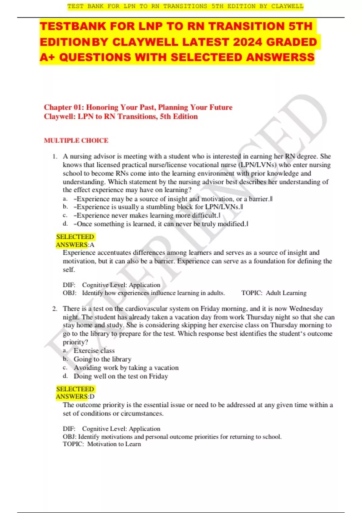 TESTBANK FOR LNP TO RN TRANSITION 5TH EDITION BY CLAYWELL LATEST 2024 GRADED A+ QUESTIONS WITH SELECTEED ANSWERSS
