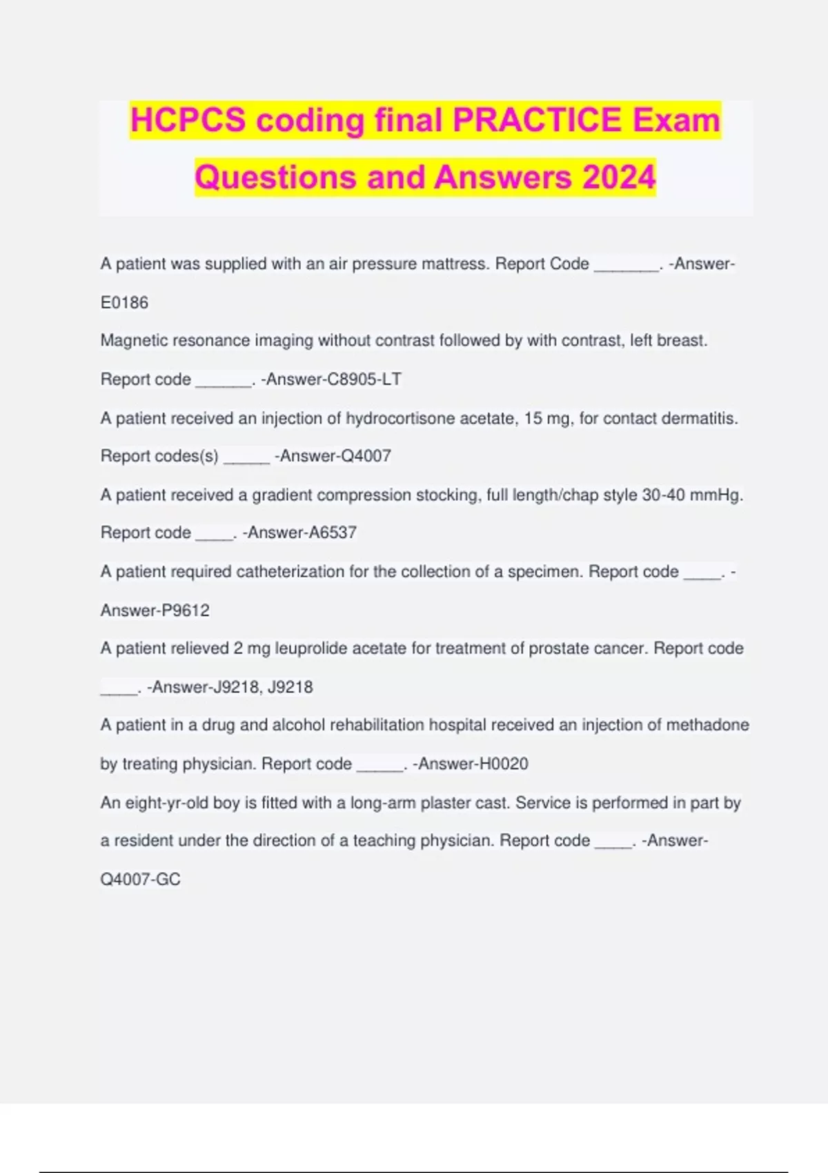 HCPCS coding final PRACTICE Exam Questions and Answers 2024 A patient was supplied with an air pressure mattress. Report Code _______. -Answer- E0186 Magnetic resonance imaging without contrast followed by with contrast, left breast. Report code ______. -Answer-C8905-LT A patient received an injection of hydrocortisone acetate, 15 mg, for contact dermatitis. Report codes(s) _____ -Answer-Q4007 A patient received a gradient compression stocking, full length/chap style 30-40 mmHg. Report code ____. -Answer-A6537 A patient required catheterization for the collection of a specimen. Report code ____. - Answer-P9612 A patient relieved 2 mg leuprolide acetate for treatment of prostate cancer. Report code ____. -Answer-J9218, J9218 A patient in a drug and alcohol rehabilitation hospital received an injection of methadone by treating physician. Report code _____. -Answer-H0020 An eight-yr-old boy is fitted with a long-arm plaster cast. Service is performed in part by a resident under the direction of a teaching physician. Report code ____. -Answer- Q4007-GC The patient's family received 30 minutes of family training and counseling, which was provided for the purpose of child development. Report codes ____. -Answer-T1027, T1027 A patient received a hand-head low-vision aid. Report code _____. -Answer-V2600 Which code is assigned for "unattended sleep study, interpretation only?" -Answer- 95806-26 A patient was seeking loss-of-wages benefits due to injuries sustained in a motor vehicle accident. The insurance company requested a second opinion regarding injuries and sent the patient for an independent Medical Exam (IME), where a level 3 outpatient consultation service was provided. The IME physician reviewed medical records from the emergency department, the primary care physician, and pain management center. The IME report was sent to the insurance company. Which code is assigned? -Answer- 99243-32 A patient presented to the physician's office for removal of ten skin tags on his torso. During the procedure, the patient became anxious and the procedure was discontinues. No skin tags were removed. Which code is reported? -Answer-11200-53 The patient underwent osteotomy of cervical spine, anterior approach, single segment, by two surgeons. Which codes is reported? -Answer-22220-62 The patient underwent a T7 index (total thyroxine) lab test, which was sent to an outside laboratory. Which code is reported? -Answer-84436-90