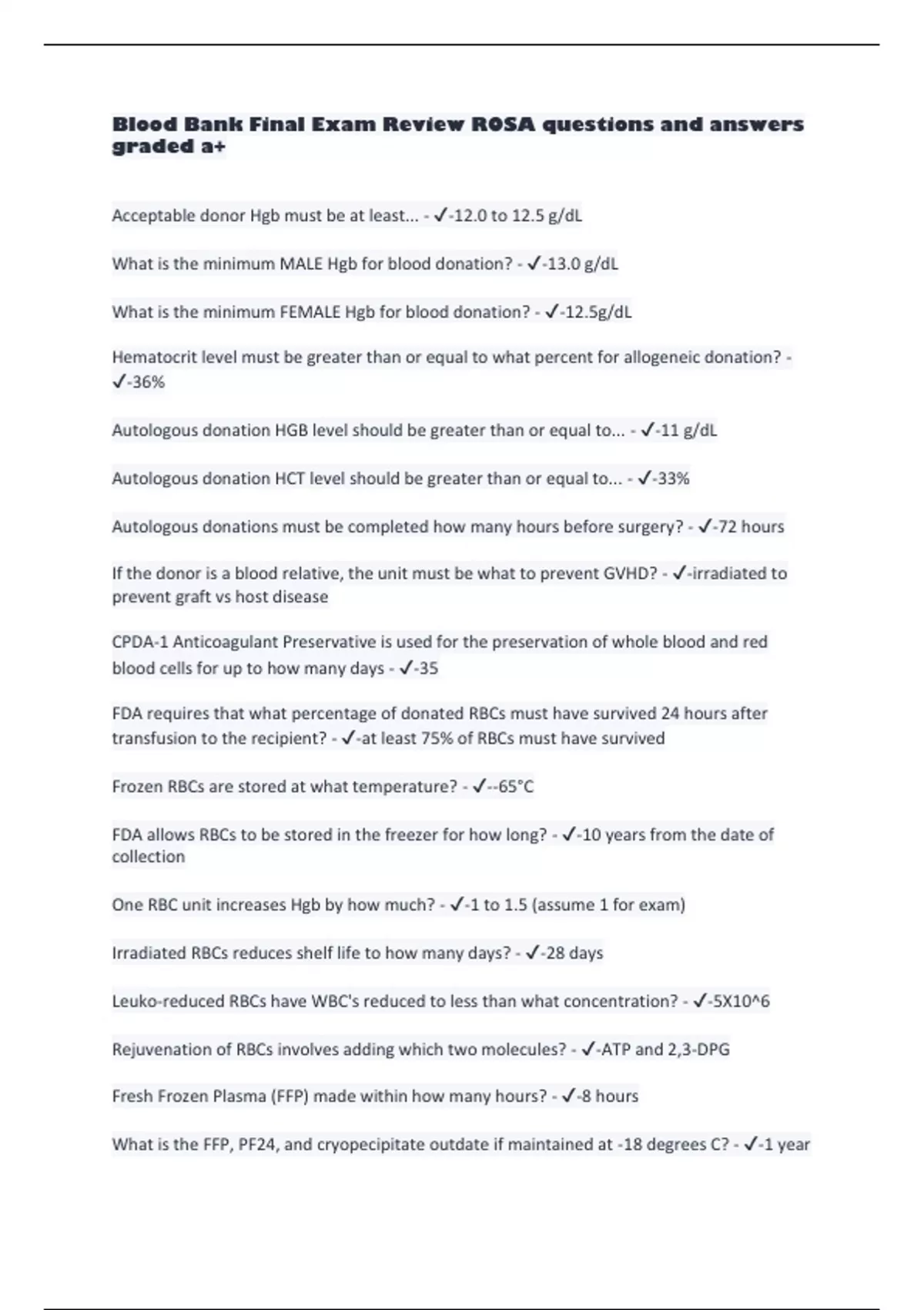 Blood Bank Final Exam Review ROSA questions and answers graded a+ Acceptable donor Hgb must be at least... - -12.0 to 12.5 g/dL What is the minimum MALE Hgb for blood donation? - -13.0 g/dL What is the minimum FEMALE Hgb for blood donation? - -12.5g/dL Hematocrit level must be greater than or equal to what percent for allogeneic donation? - -36% Autologous donation HGB level should be greater than or equal to... - -11 g/dL Autologous donation HCT level should be greater than or equal to... - -33% Autologous donations must be completed how many hours before surgery? - -72 hours If the donor is a blood relative, the unit must be what to prevent GVHD? - -irradiated to prevent graft vs host disease CPDA-1 Anticoagulant Preservative is used for the preservation of whole blood and red blood cells for up to how many days - -35 FDA requires that what percentage of donated RBCs must have survived 24 hours after transfusion to the recipient? - -at least 75% of RBCs must have survived Frozen RBCs are stored at what temperature? - --65°C FDA allows RBCs to be stored in the freezer for how long? - -10 years from the date of collection One RBC unit increases Hgb by how much? - -1 to 1.5 (assume 1 for exam) Irradiated RBCs reduces shelf life to how many days? - -28 days Leuko-reduced RBCs have WBC's reduced to less than what concentration? - -5X10^6 Rejuvenation of RBCs involves adding which two molecules? - -ATP and 2,3-DPG Fresh Frozen Plasma (FFP) made within how many hours? - -8 hours What is the FFP, PF24, and cryopecipitate outdate if maintained at -18 degrees C? - -1 yea