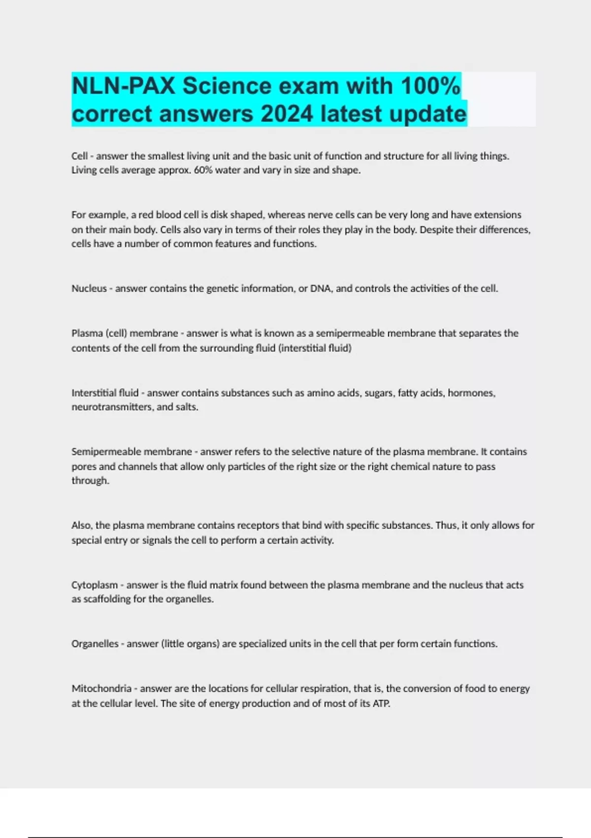 NLN-PAX Science exam with 100% correct answers 2024 latest update