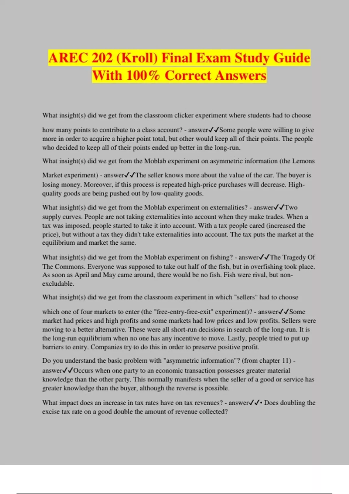 AREC 202 (Kroll) Final Exam Study Guide With 100% Correct Answers What insight(s) did we get from the classroom clicker experiment where students had to choose how many points to contribute to a class account? - answerSome people were willing to give more in order to acquire a higher point total, but other would keep all of their points. The people who decided to keep all of their points ended up better in the long-run. What insight(s) did we get from the Moblab experiment on asymmetric information (the Lemons Market experiment) - answerThe seller knows more about the value of the car. The buyer is losing money. Moreover, if this process is repeated high-price purchases will decrease. High- quality goods are being pushed out by low-quality goods. What insight(s) did we get from the Moblab experiment on externalities? - answerTwo supply curves. People are not taking externalities into account when they make trades. When a tax was imposed, people started to take it into account. With a tax people cared (increased the price), but without a tax they didn't take externalities into account. The tax puts the market at the equilibrium and market the same. What insight(s) did we get from the Moblab experiment on fishing? - answerThe Tragedy Of The Commons. Everyone was supposed to take out half of the fish, but in overfishing took place. As soon as April and May came around, there would be no fish. Fish were rival, but non- excludable. What insight(s) did we get from the classroom experiment in which "sellers" had to choose which one of four markets to enter (the "free-entry-free-exit" experiment)? - answerSome market had prices and high profits and some markets had low prices and low profits. Sellers were moving to a better alternative. These were all short-run decisions in search of the long-run. It is the long-run equilibrium when no one has any incentive to move. Lastly, people tried to put up barriers to entry. Companies try to do this in order to preserve positive profit. Do you understand the basic problem with "asymmetric information"? (from chapter 11) - answerOccurs when one party to an economic transaction possesses greater material knowledge than the other party. This normally manifests when the seller of a good or service has greater knowledge than the buyer, although the reverse is possible. What impact does an increase in tax rates have on tax revenues? - answer• Does doubling the excise tax rate on a good double the amount of revenue collected? • No, because the tax increase will reduce the Q of the good or service transacted. • In some cases, raising the tax rate may actually reduce the amount of revenue the government collects. What impact do price-elasticities of demand and of supply have on "tax incidence"? - answer1) It does not depend on where the revenue is collected, but on the price elasticity of demand and price elasticity of supply. 2) Tax incidence falls mostly upon the group that responds least to price (the group that has the most inelastic price-quantity curve). 3) When the price elasticity of demand is lower (inelastic) and the price elasticity of supply is higher (elastic), the burden mainly falls on consumers. 4) When the price of elasticity of demand is higher (elastic) and the price of elasticity of supply is lower (inelastic), the burden mainly falls on the producers. What is "tax incidence?" - answerA measure of who really pays it (= who really bears the burden of the tax) Does doubling a sales tax usually result in doubling tax revenues? - answerNo, it does not. It can sometimes lead to a reduction in