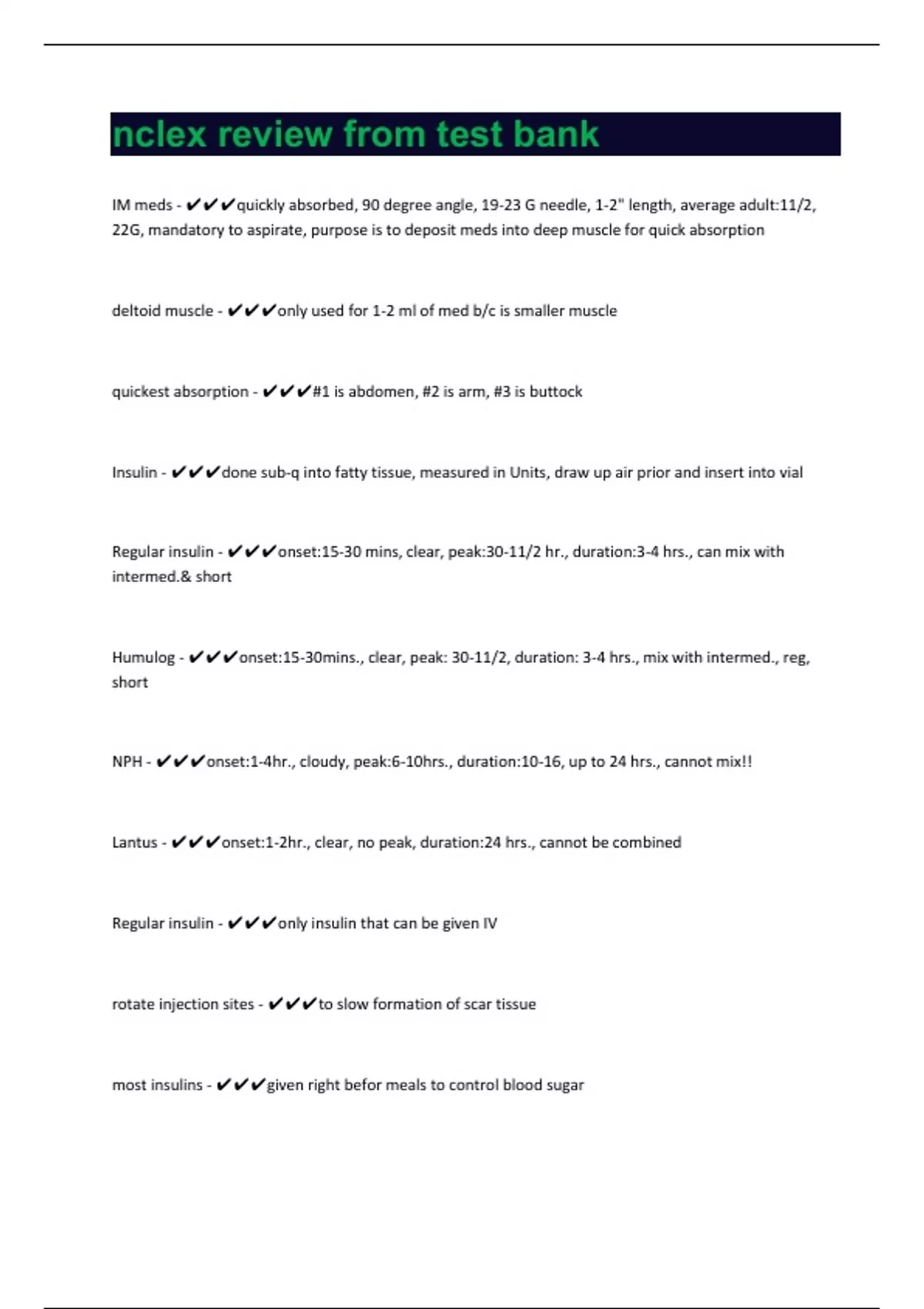 Regular insulin - ✔✔✔onset:15-30 mins, clear, peak:30-11/2 hr., duration:3-4 hrs., can mix with