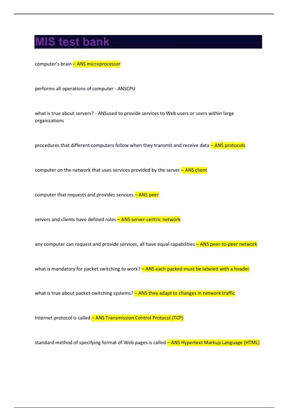 computer's brain – ANS microprocessor performs all operations of computer - ANSCPU what is true about servers? - ANSused to provide services to Web users or users within large organizations procedures that different computers follow when they transmit and receive data – ANS protocols computer on the network that uses services provided by the server – ANS client computer that requests and provides services – ANS peer servers and clients have defined roles – ANS server-centric network any computer can request and provide services, all have equal capabilities – ANS peer-to-peer network what is mandatory for packet switching to work? – ANS each packed must be labeled with a header what is true about packet-switching systems? – ANS they adapt to changes in network traffic Internet protocol is called – ANS Transmission Control Protocol (TCP) standard method of specifying format of Web pages is called – ANS Hypertext Markup Language (HTML)